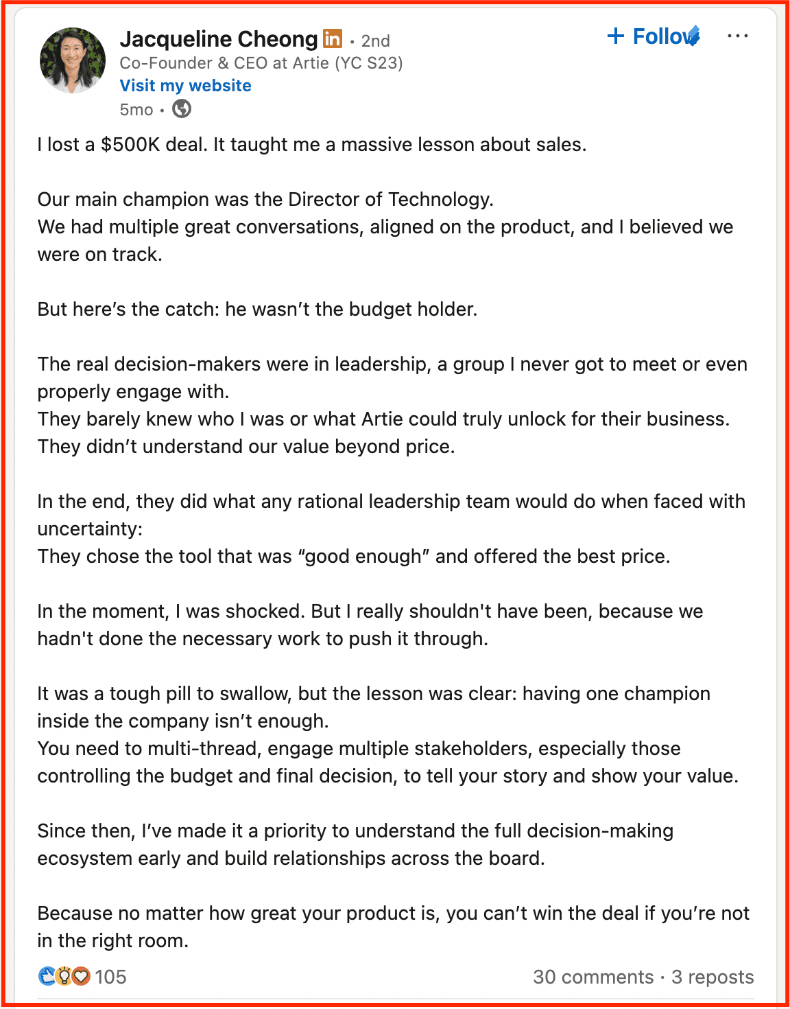 Example: “I once lost a $500k deal because I failed to ask one critical question…”