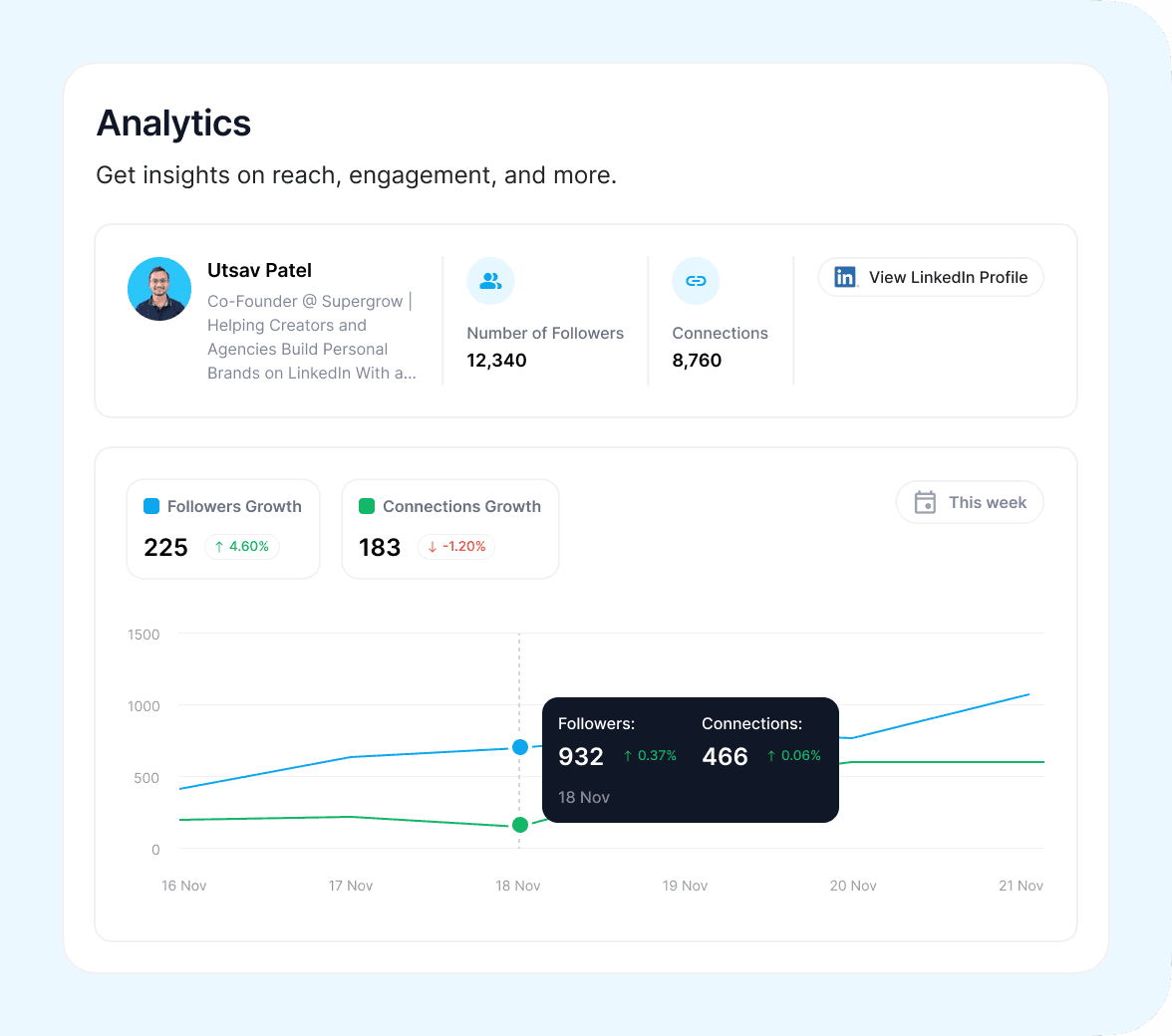 While these strategies can be applied manually, Supergrow’s advanced analytics dashboard shows you exactly which formats, topics, and posting patterns drive the highest impressions on LinkedIn.