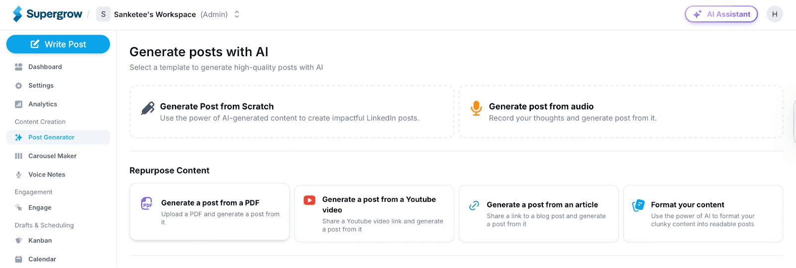 Supergrow makes this effortless. By analyzing which formats perform well and repurposing your ideas into carousels, text posts, videos, and more, you support consistency without adding unnecessary complexity.