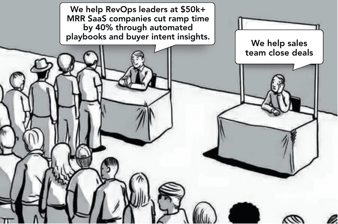 Your real offer–market fit is “I help RevOps leaders at SaaS companies doing $50k+ in MRR reduce ramp time by 40% using automated playbooks and buyer-intent insights.”
