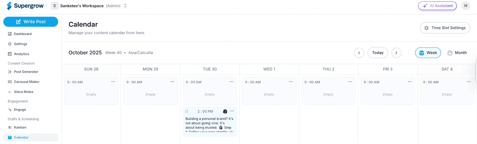 You can also use Supergrow's post scheduling feature to plan posts, auto-schedule first comments with links or bonus insights, and keep your calendar consistent without chasing reminders.