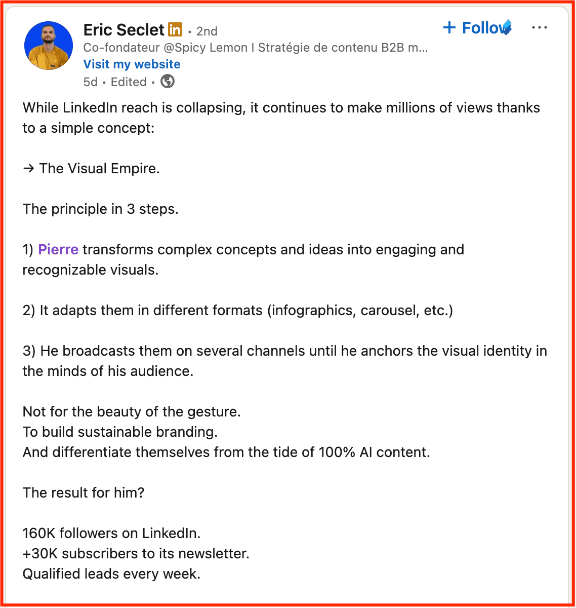 For instance, Pierre Herubel is recognised for using a visual framework to highlight high-level marketing strategies. Eric Seclét, co-founder of SpicyLemon, publicly endorsed one of Pierre’s ideas in his own post.