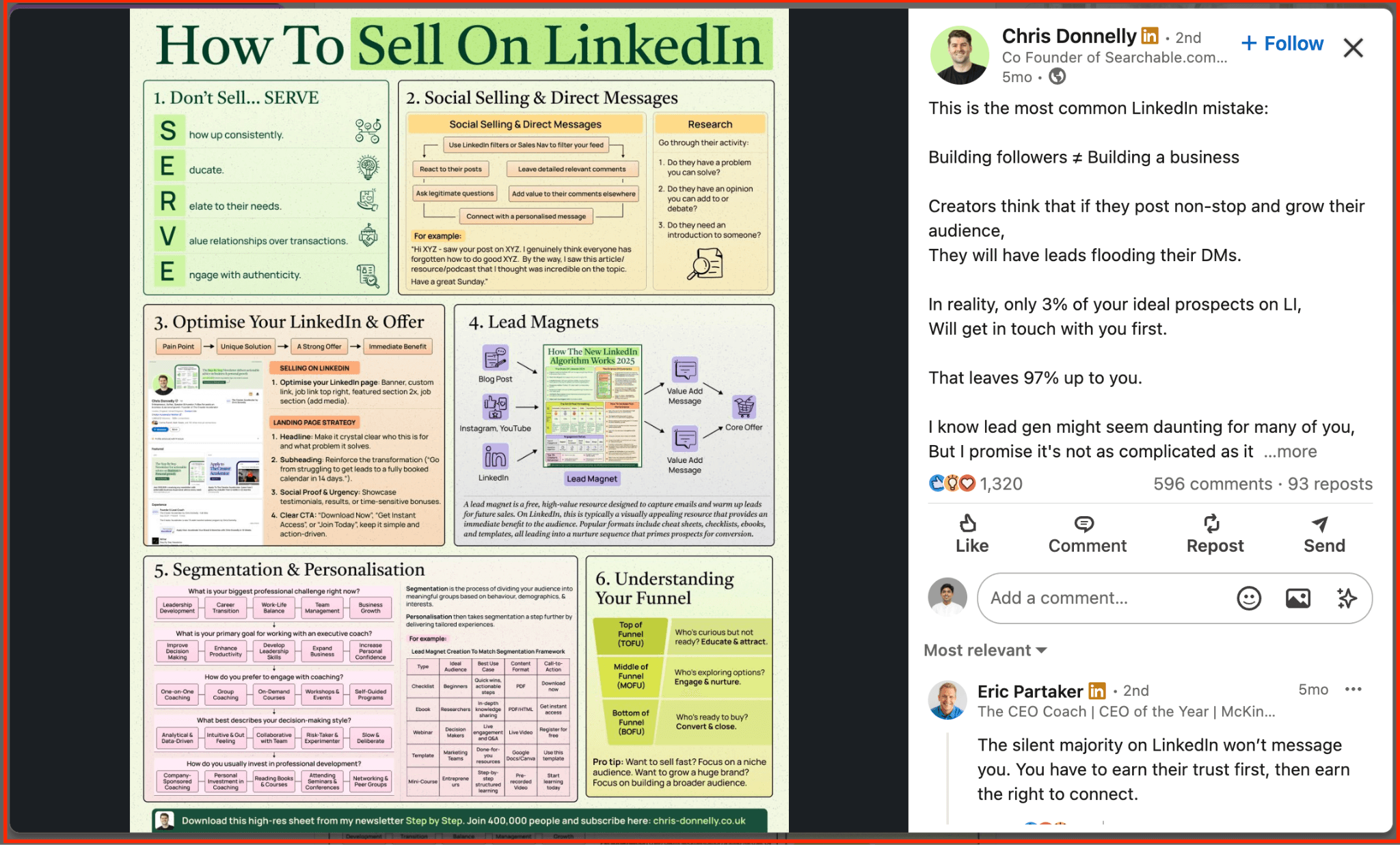 For instance, Chris Donnelly, co-founder of Searchable, has grown 270K followers over the last 6 months with daily cheat sheets: