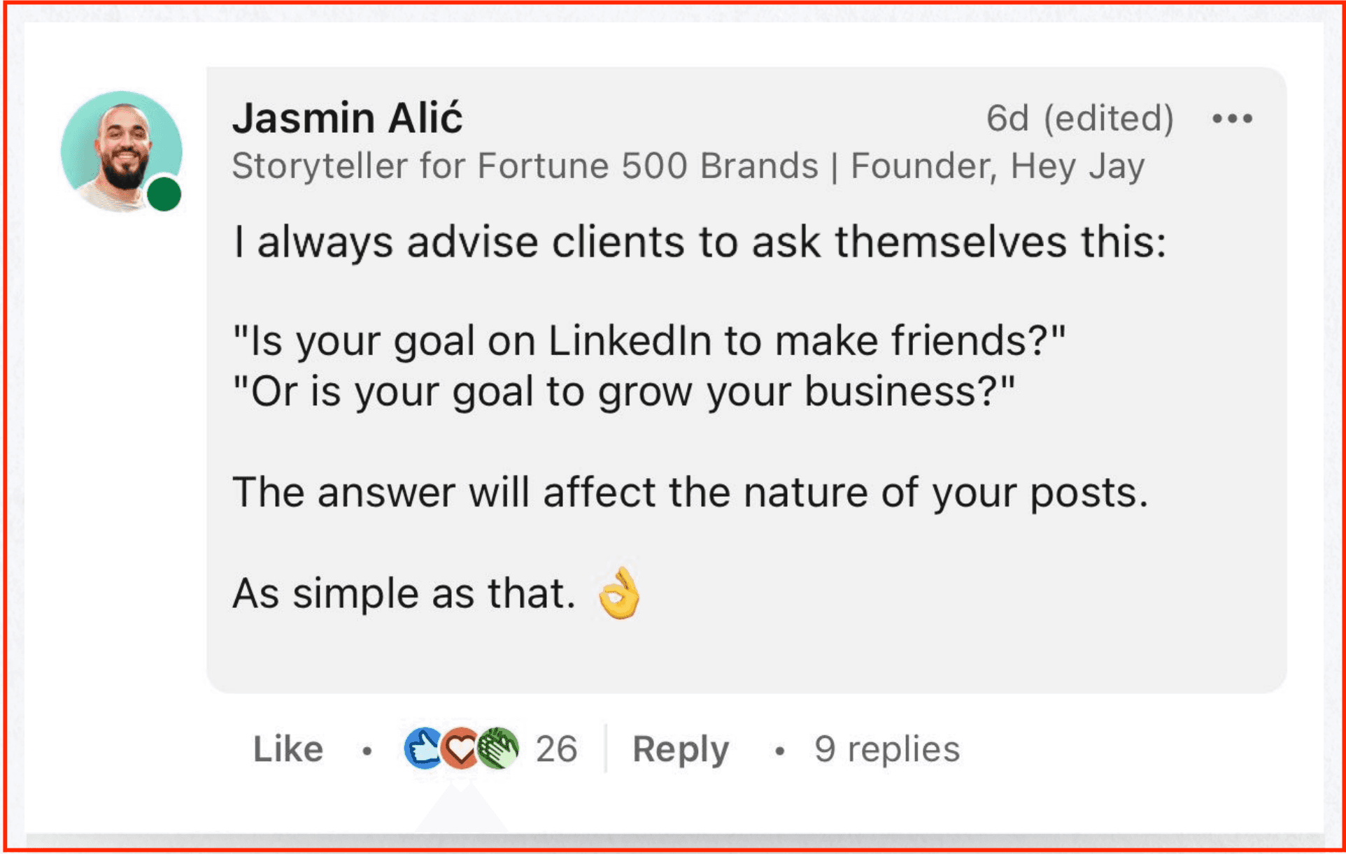 The hook doesn’t look like any modern LinkedIn growth influencer’s: No number game, no out-of-the-world storyline, no manufactured virality.