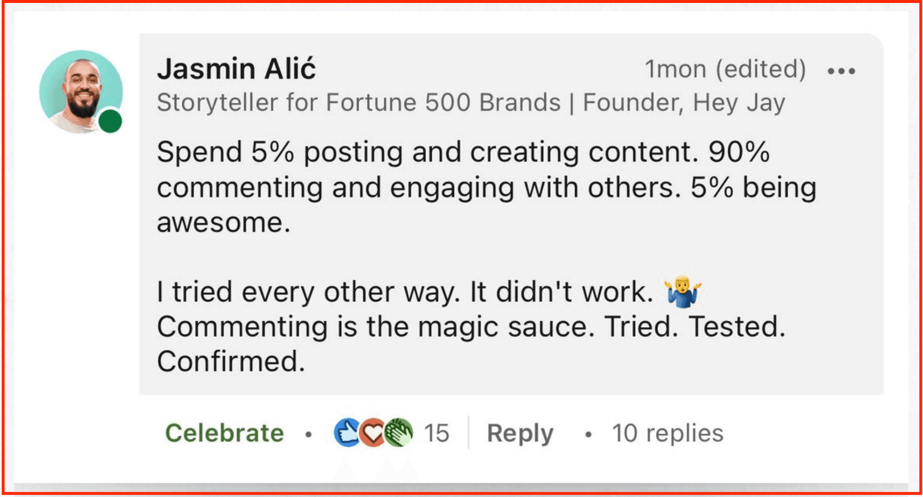 Ignore what you might’ve heard about the LinkedIn algorithm working against you. Ignore the lazy advice of posting regularly means being recognised.