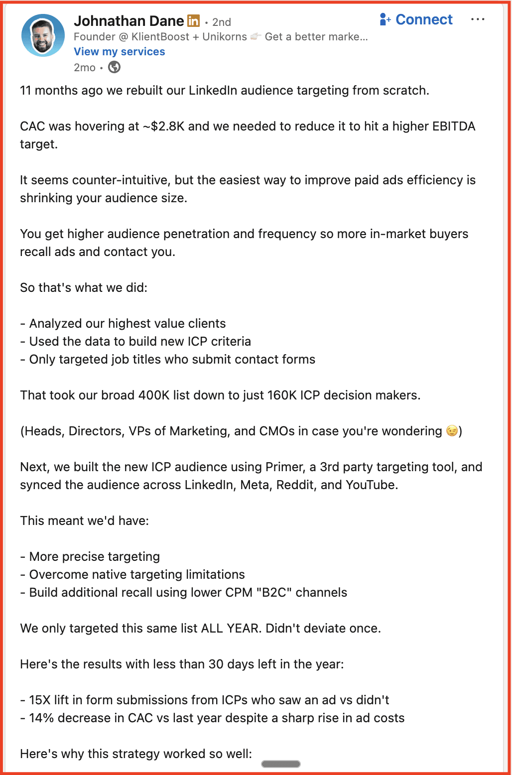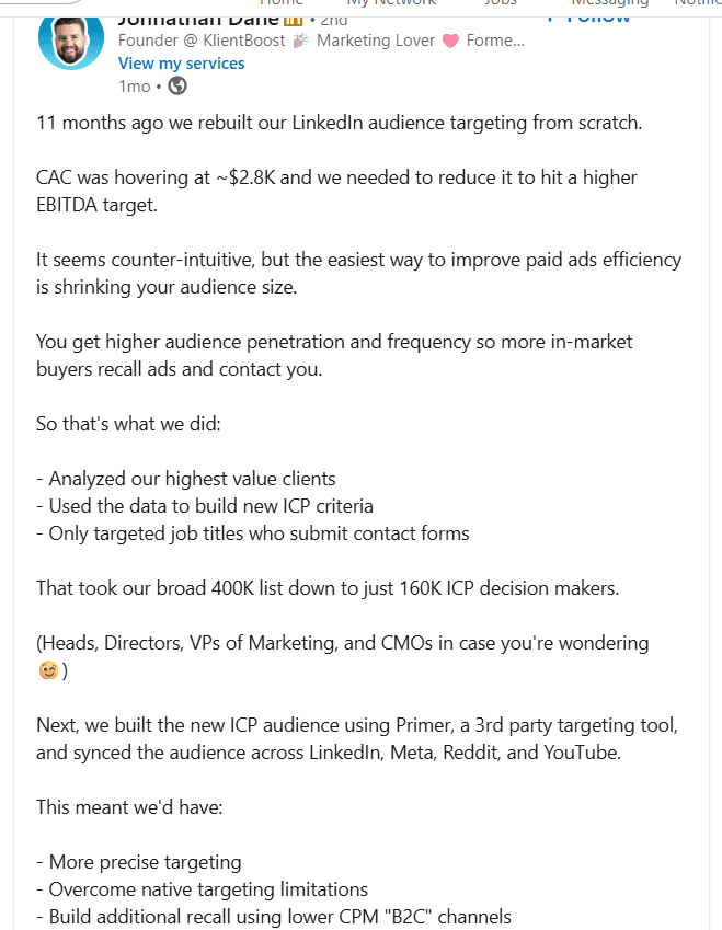 Over time, this kind of content acts as a qualifier. It attracts buyers who already agree with—or are willing to be convinced by- KlientBoost’s philosophy, while quietly pushing away those who are chasing vanity metrics or shortcuts.