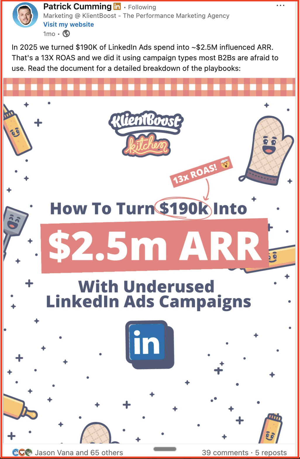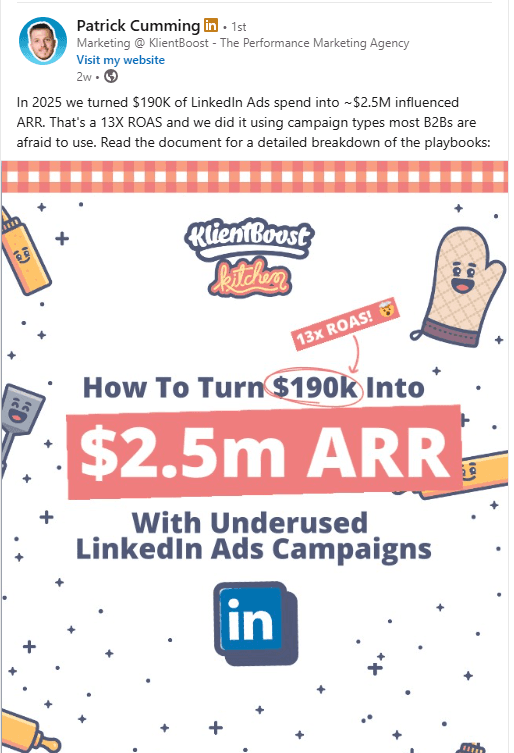 For instance, this carousel post for LinkedIn Ads Campaign shows prospects that KlientBoost isn’t theorizing from the sidelines; they’re making trade-offs, spending real budgets, and learning in real time.