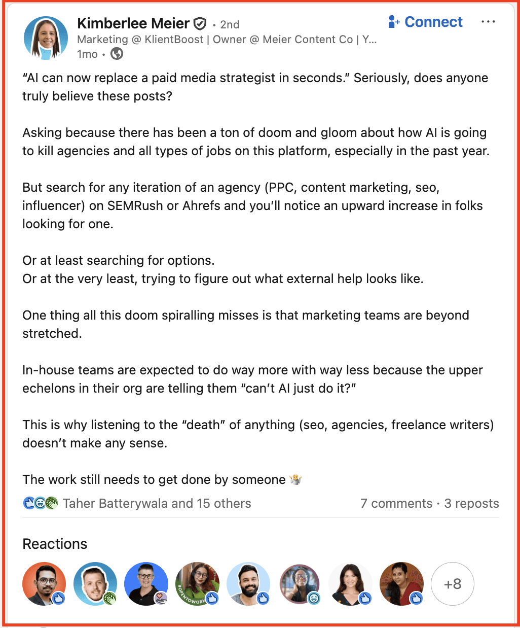 Kimberlee Meier says, “The stat that made me most bullish about employee advocacy was that social-influenced deals were worth$11-15K more in LTV than deals from email or organic search. And double what LLM-sourced deals were worth.”
