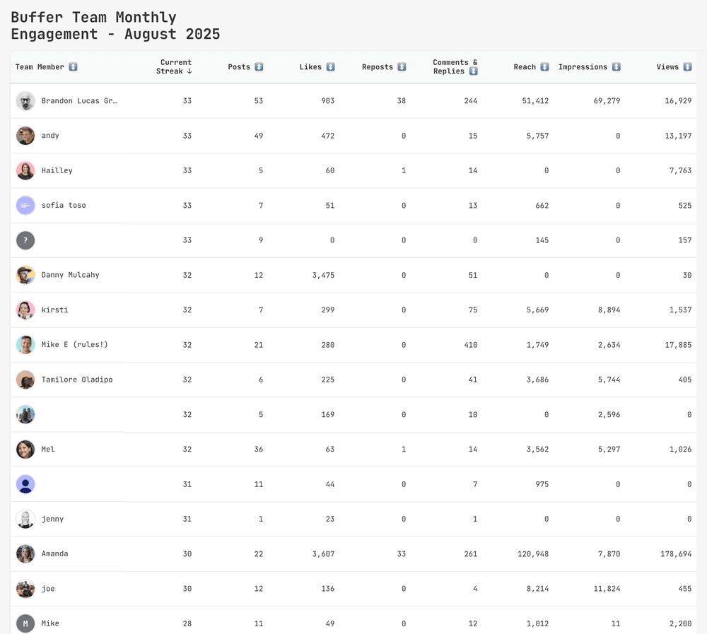 While tracking numbers is useful, Buffer also celebrates the people behind the advocacy without making it into a high-stakes competition.