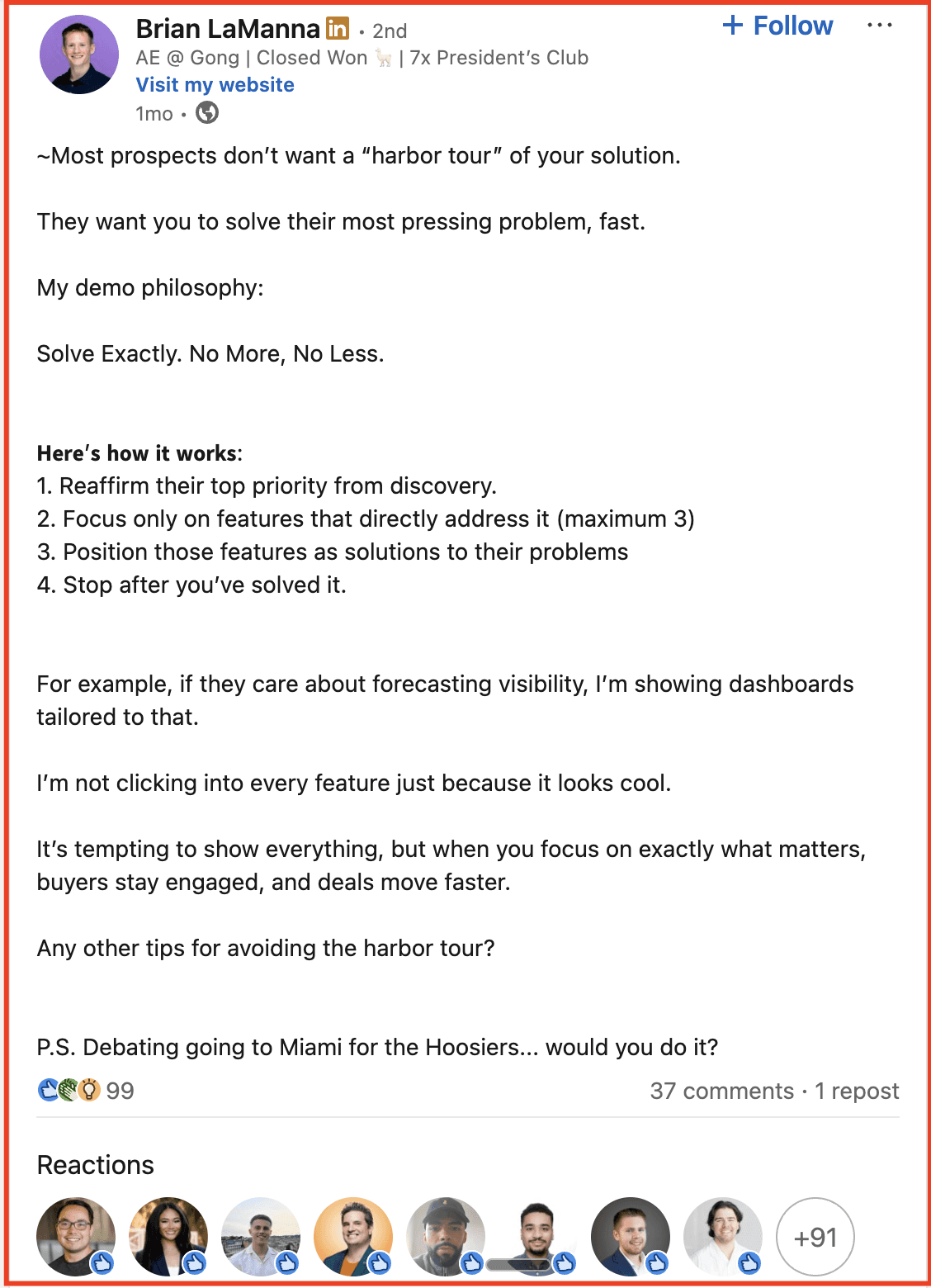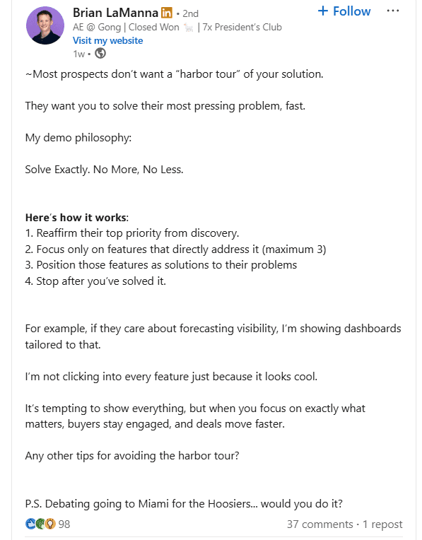 Similarly, Brian LaManna, Enterprise Account Executive, shapes a perspective that resonates with frontline sales leaders and managers who feel these problems daily and are often key champions in the buying process.