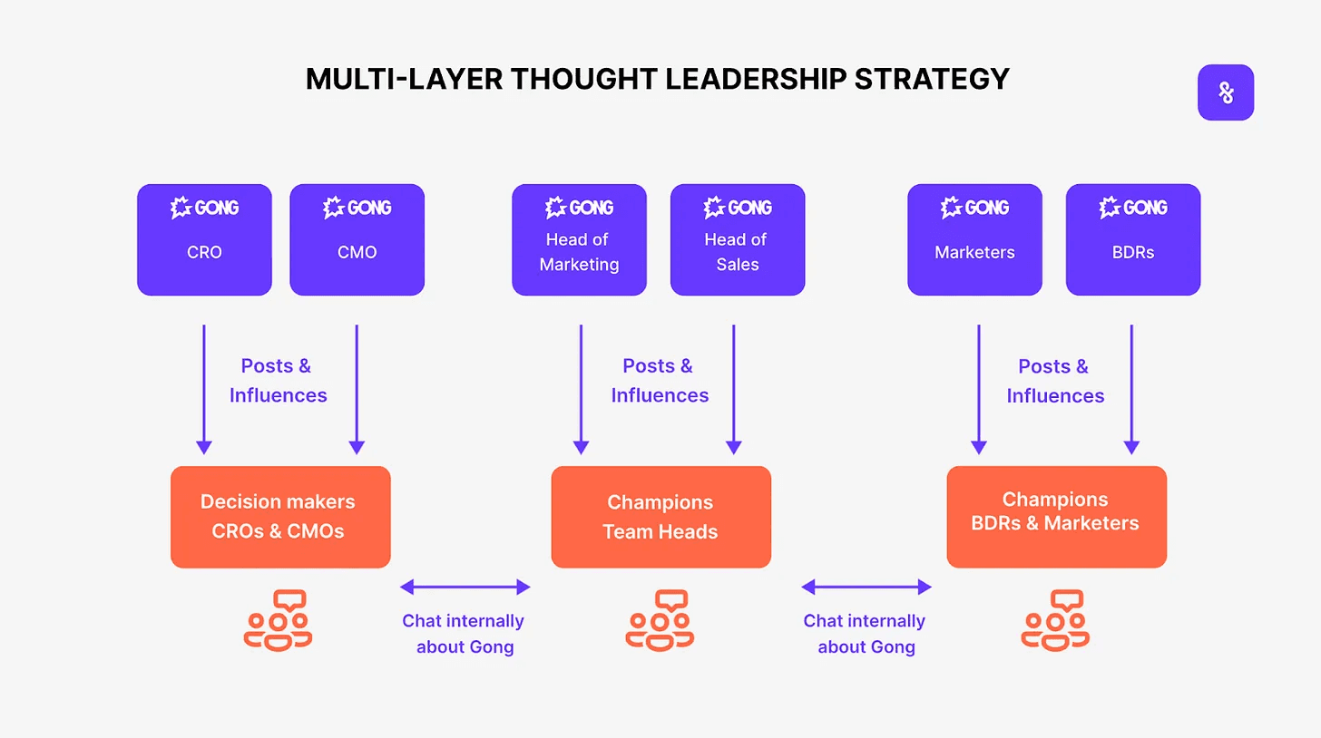 Each thought leader can reach and influence different layers of the target audience in their own unique ways, whether as a CEO, CMO, Head of Content, BDR, or Sales leader.
