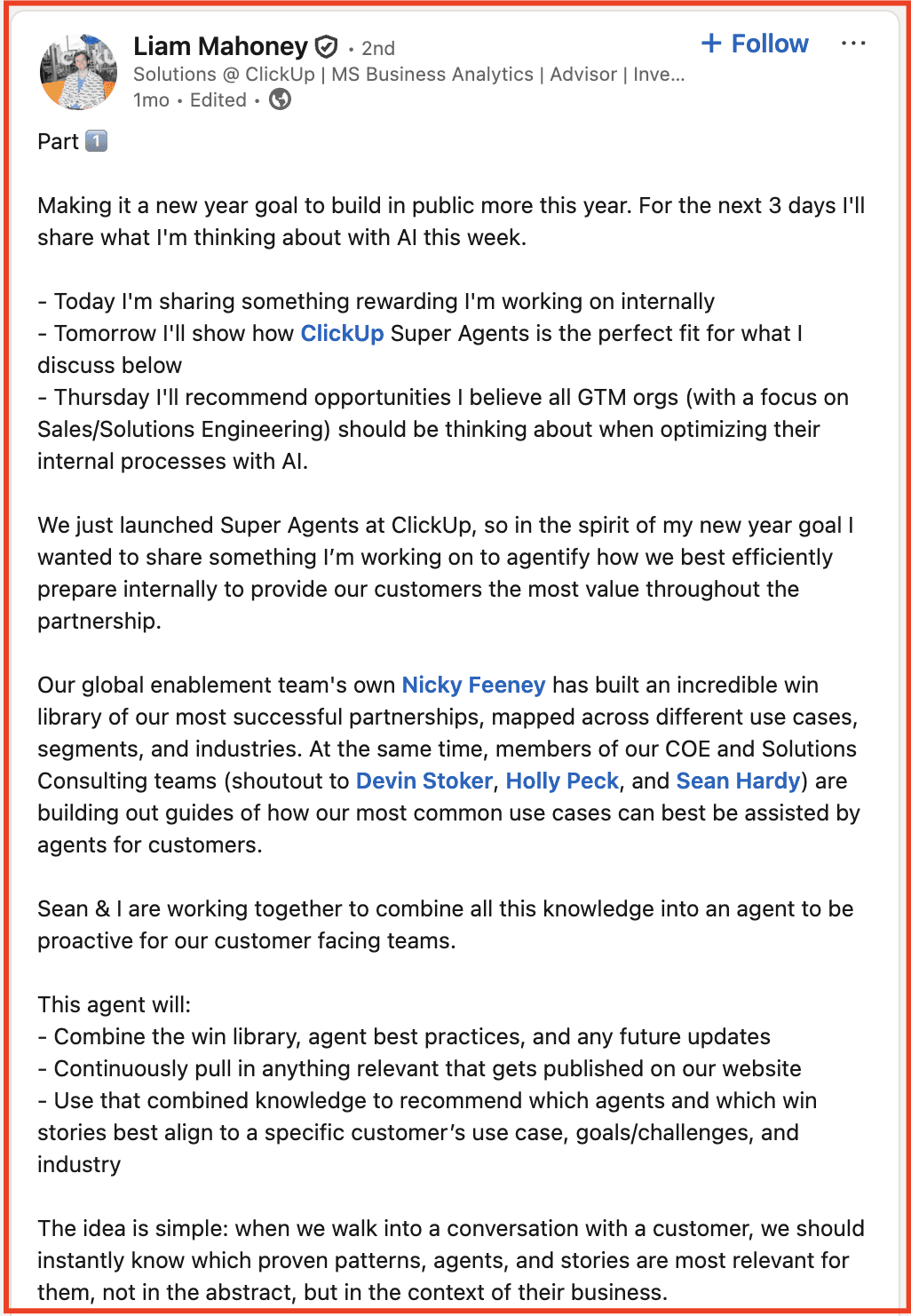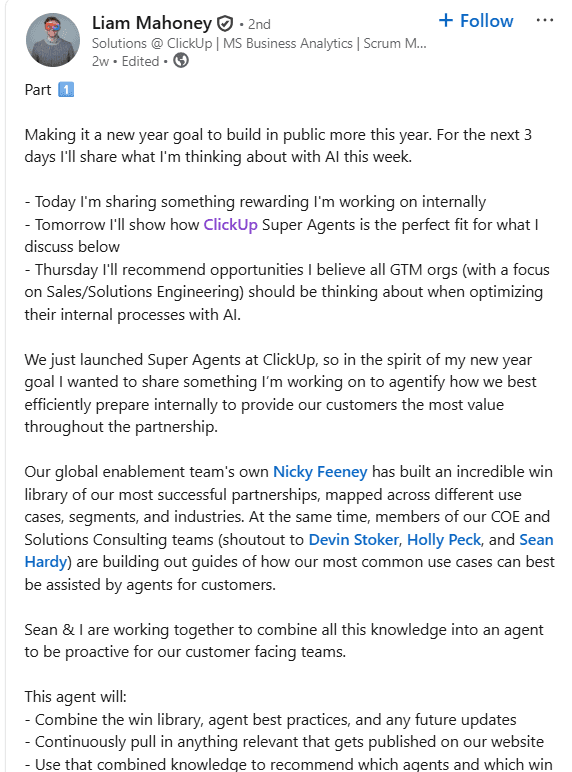 Liam Mahoney, a solution engineer at ClickUp, does a great job in translating: