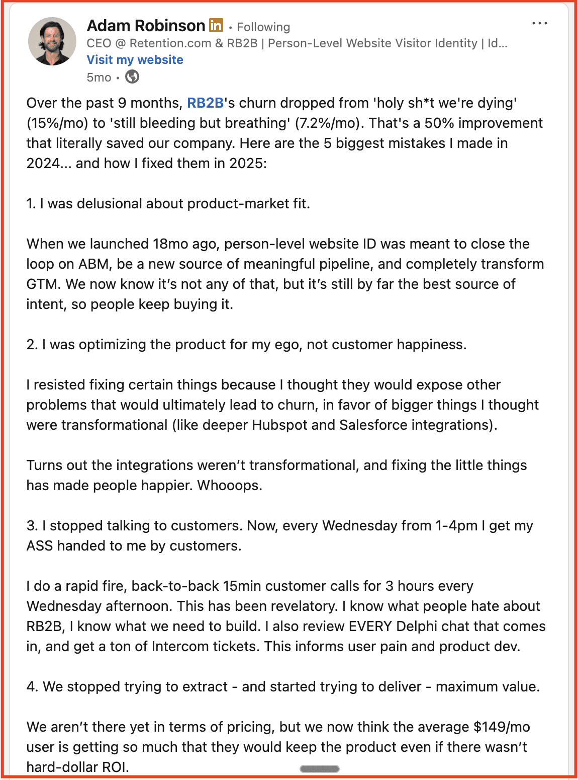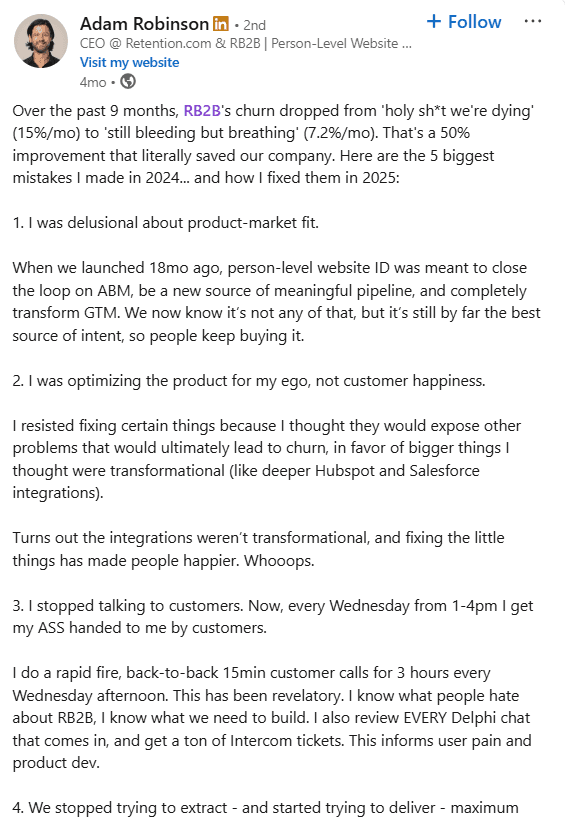 Adam’s content spoke directly to SaaS founders, operators, and revenue leaders–pricing strategy, customer psychology, churn, positioning, and real-world experimentation. Every insight he put out was tightly aligned with the exact problems his audience was already trying to solve.