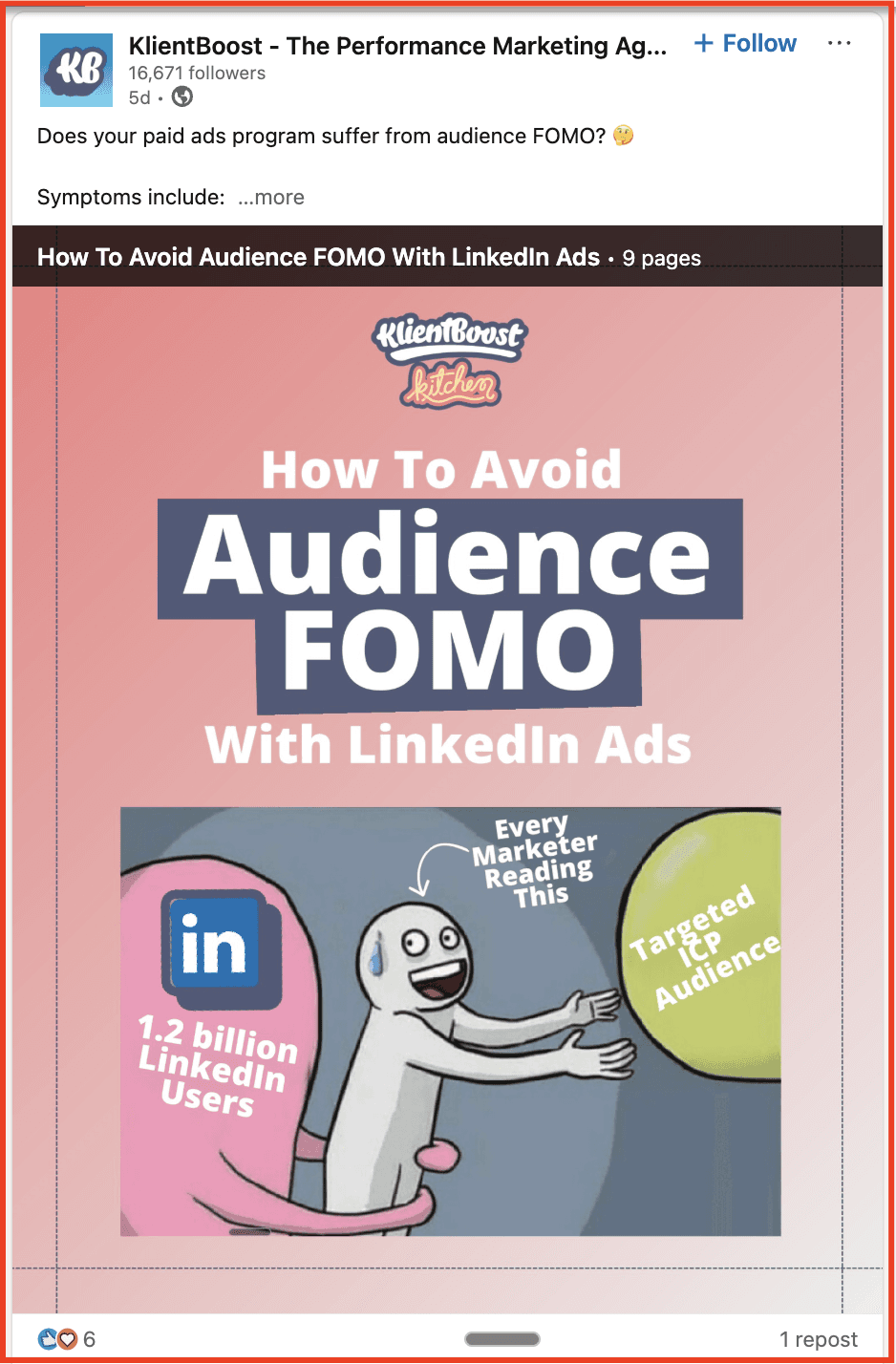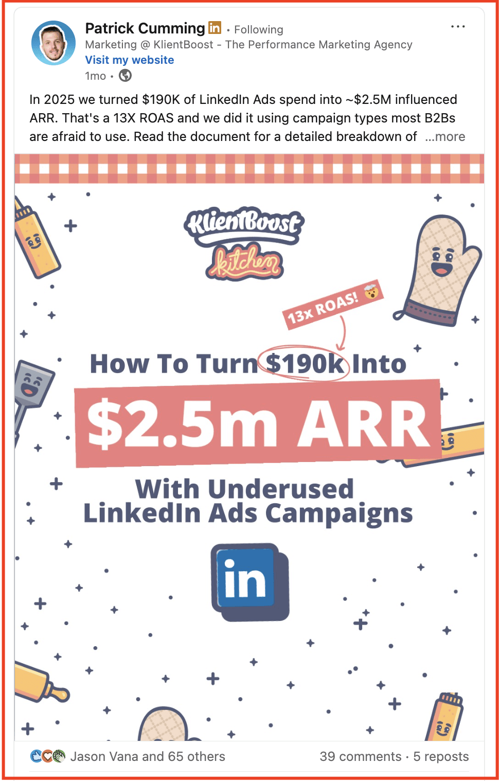 This carousel post for LinkedIn Ads Campaign shows prospects that KlientBoost isn’t theorizing from the sidelines; they’re making trade-offs, spending real budgets, and learning in real time.