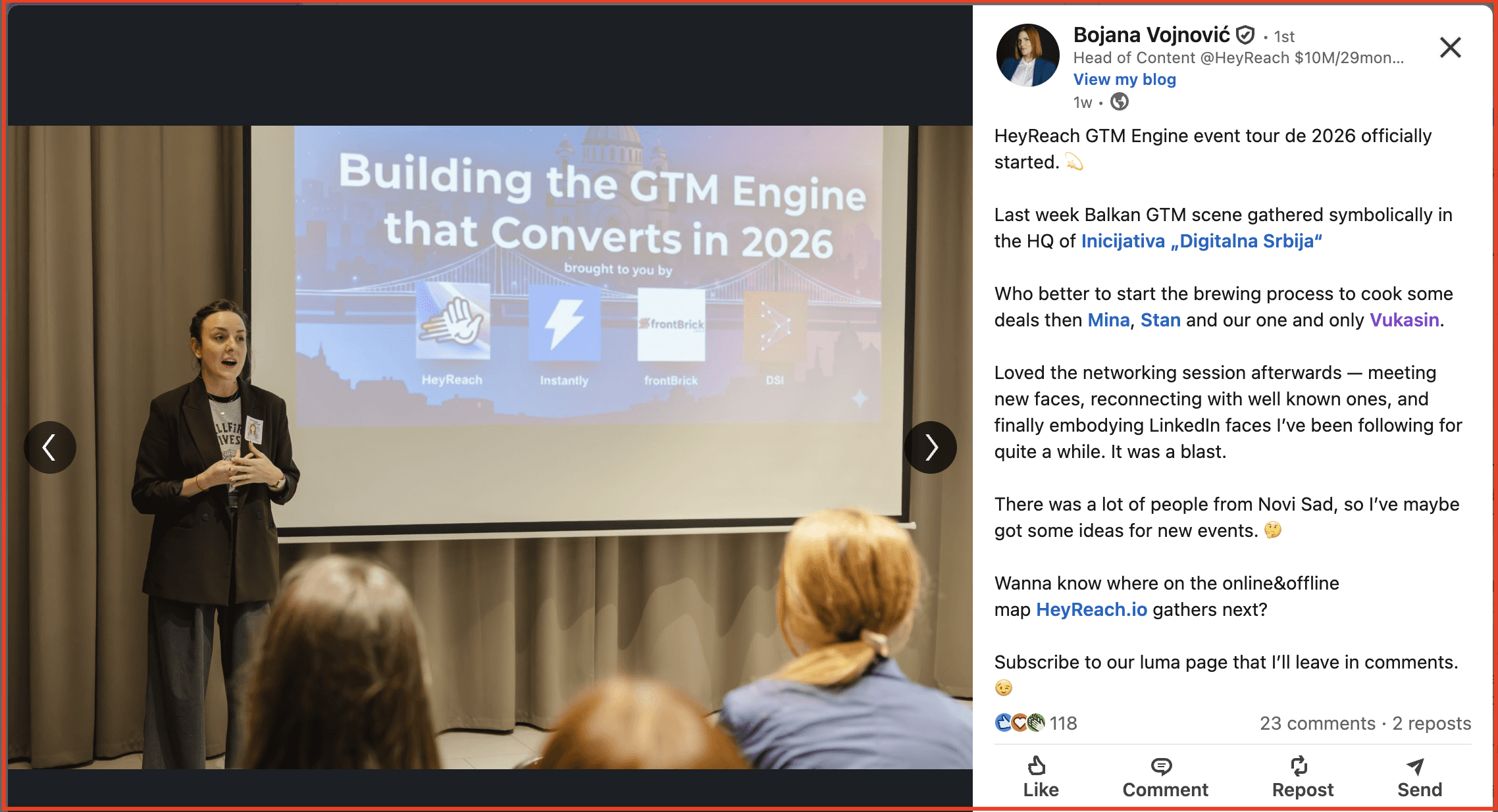 For instance, this post by Bojana Vojnović about attending a HeyReach event performed well not because it pushed the brand, but because it captured what actually attracts people: real experiences, real relationships, and the momentum of a growing HeyReach community.