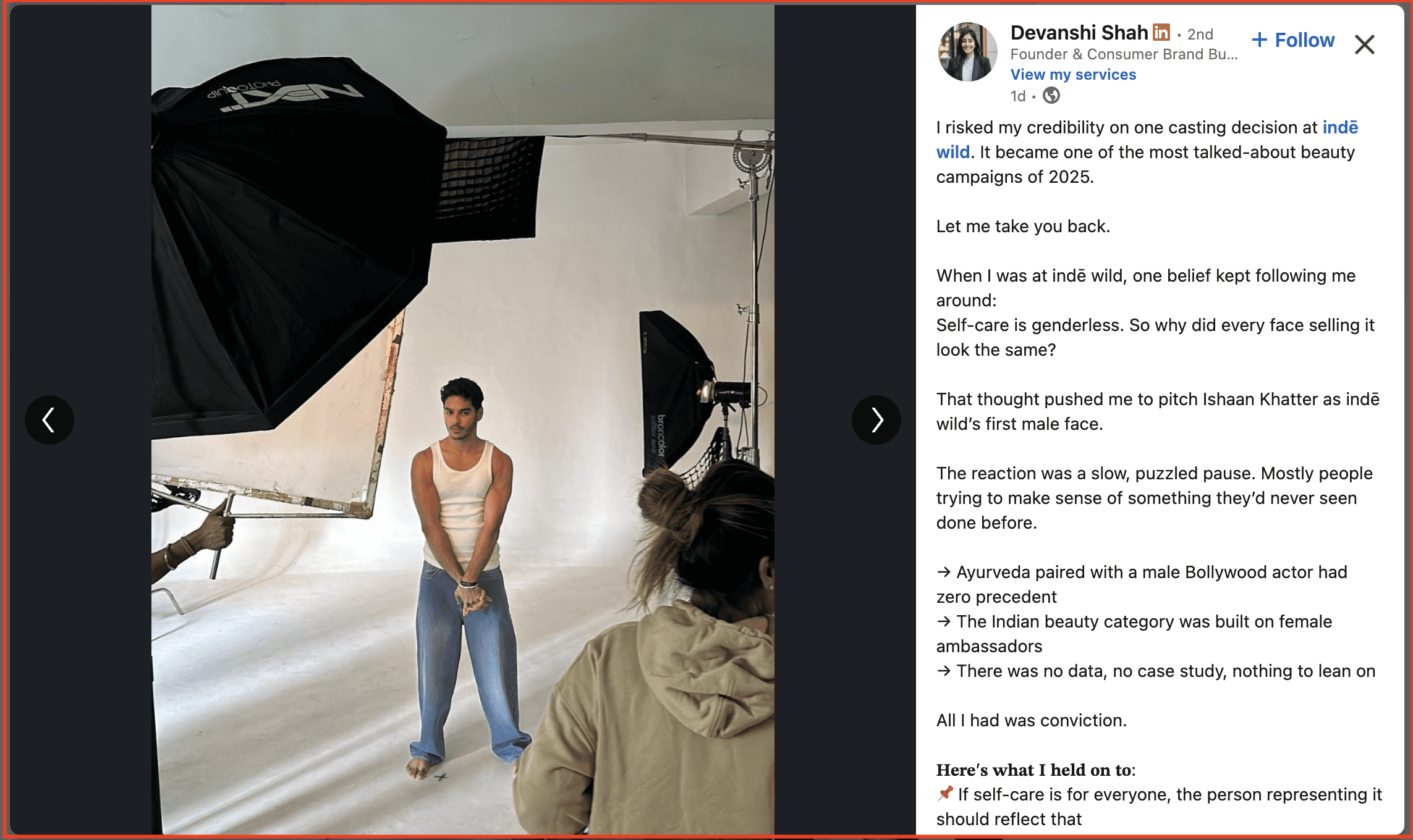 Post by Devanshi Shah from Indie Wild shares a personal narrative on doing a marketing campaign for the brand. The storytelling structure keeps posts grounded and professional while remaining personal.