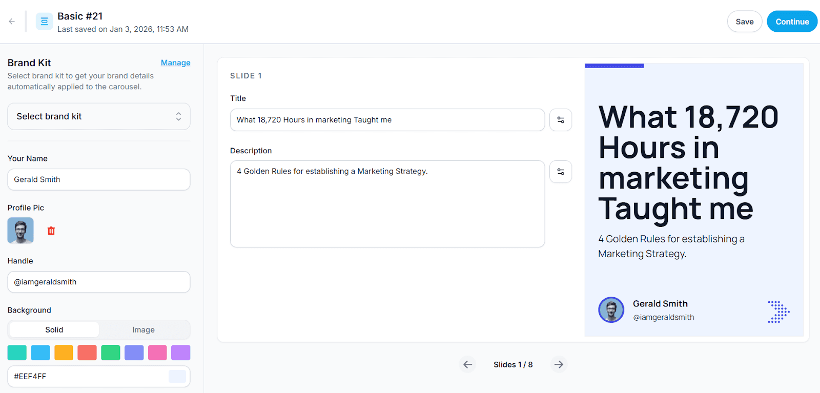 Pro Tip: If you’re creating LinkedIn carousels manually, duplicate the first slide to maintain brand consistency throughout the carousel.