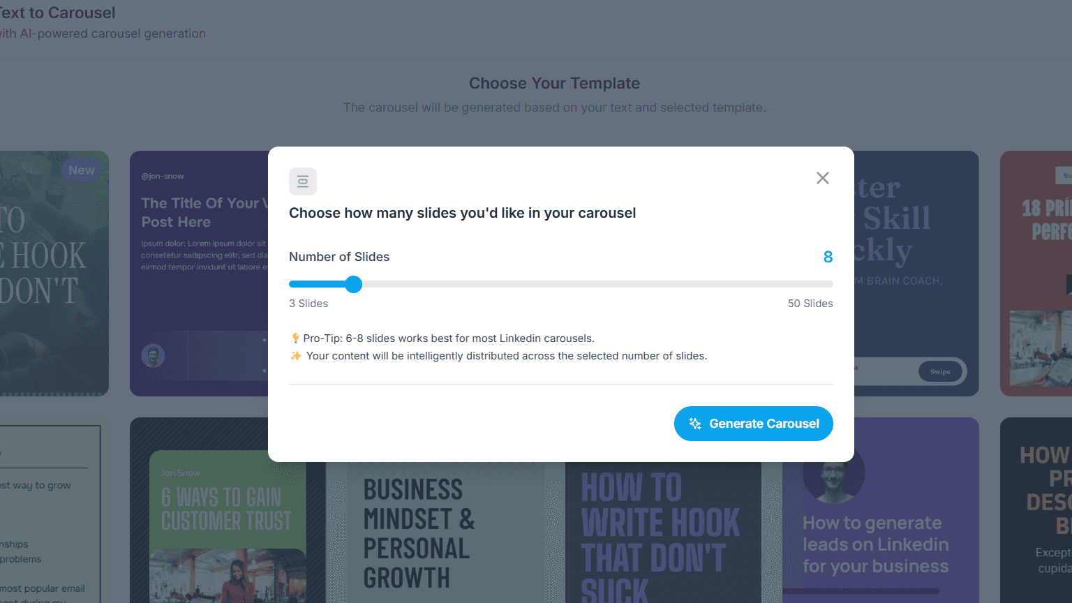 To speed up the process, use the “Text to Carousel” feature in Carousel Maker to transform any idea into LinkedIn carousels. Add the text, template, and select the number of slides, and voila–you’ll get your LinkedIn carousel ready in under a minute.