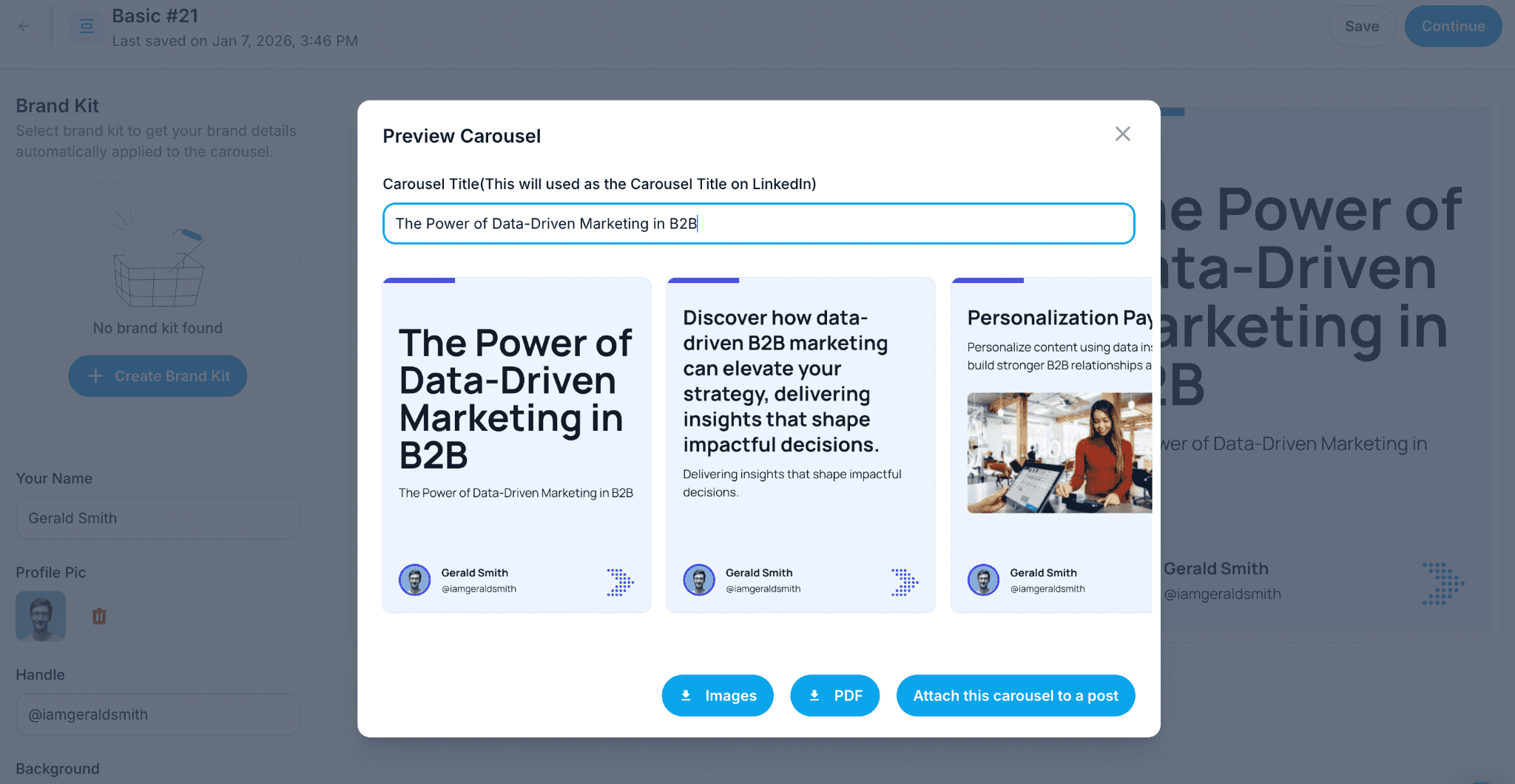 Creating LinkedIn carousels with Canva is effective when done occasionally. But once carousels become part of your regular content strategy, the cracks start to show. You ideate in one place, write copy in another, design slides separately, export PDFs, then switch back to LinkedIn to publish—every single time.
