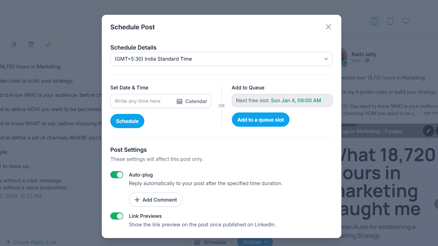 Once everything is in order, hit publish immediately or schedule it for peak engagement using Supergrow’s LinkedIn-first calendar. Turn on auto-plug comments to drop hashtags, context, or a CTA as the first comment—without hurting reach.