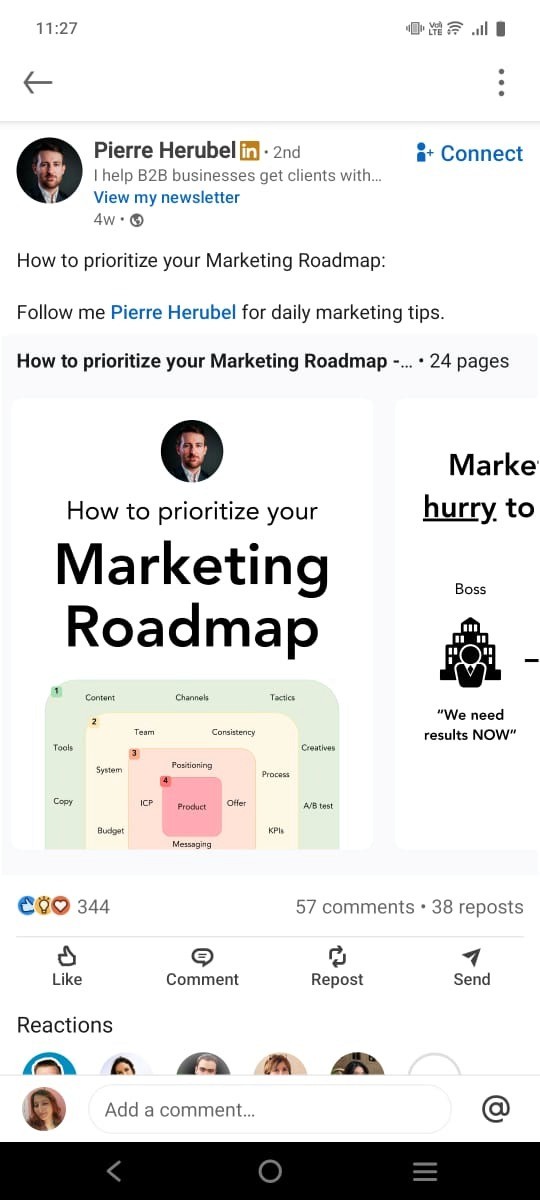 Remember, LinkedIn's algorithm favors posts that generate early engagement, so sharing at the right time and being active right after posting can help your carousel reach more people.