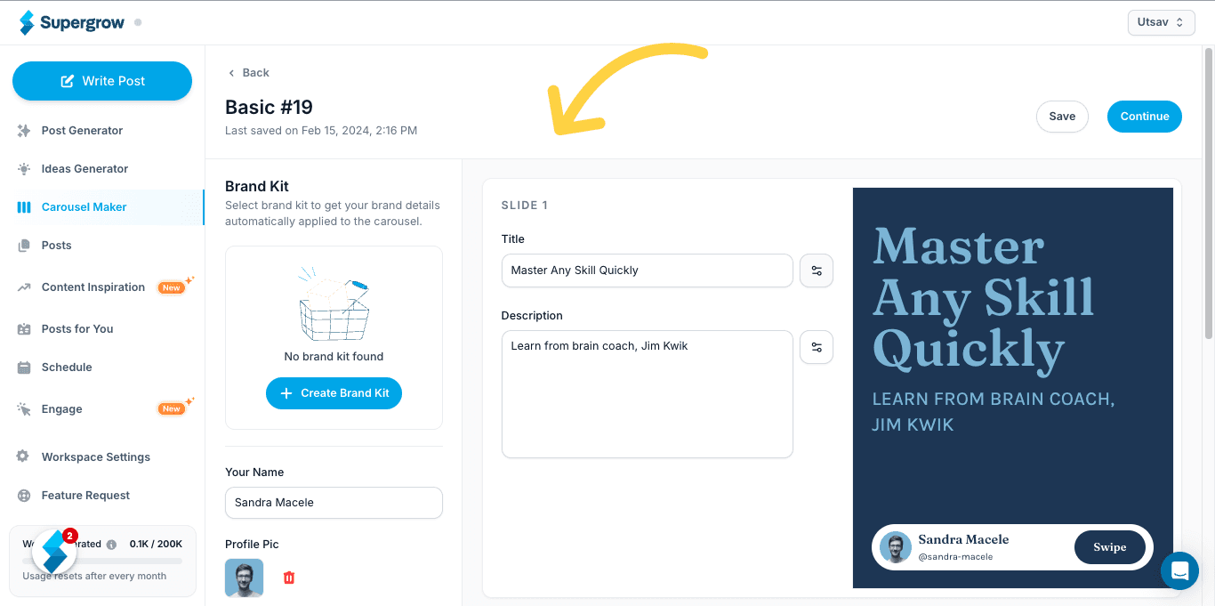 But the hardest part of creating LinkedIn carousels is finding newer ideas. Unlike other LinkedIn carousel generator platforms like Canva, which focus solely on design, Supergrow helps you create carousel content in minutes using AI.