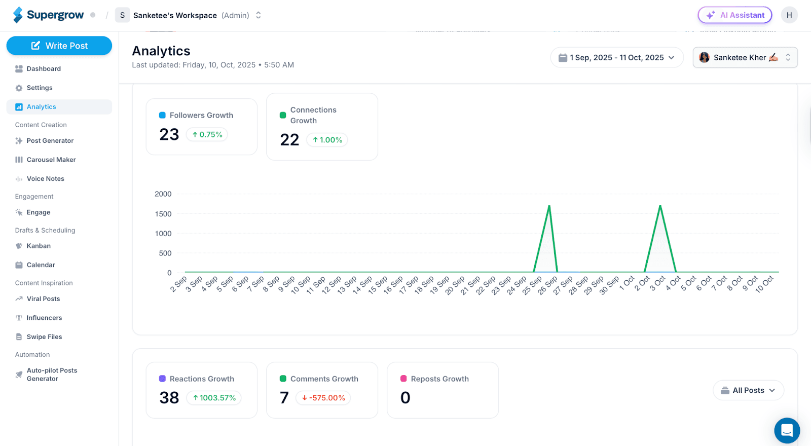 But LinkedIn’s native analytics aren’t enough if you want real impact. Supergrow’s analytics simplify the process by consolidating engagement data, identifying your top-performing posts, and revealing what resonates most with your audience. It even highlights your top commenters so you can engage more with them to maintain momentum.