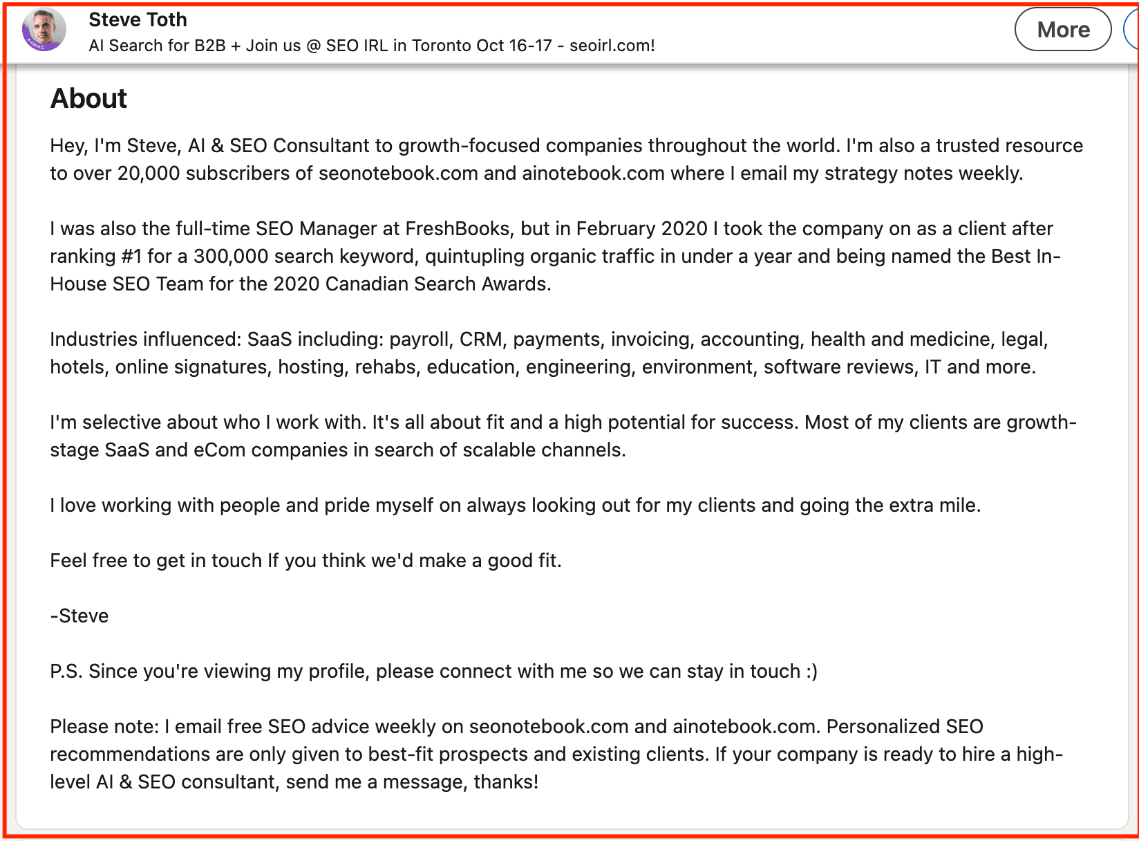 For instance, Steve Toth, founder of SEO Notebook, uses his About section to combine credibility with personality, exactly what an optimized profile needs.