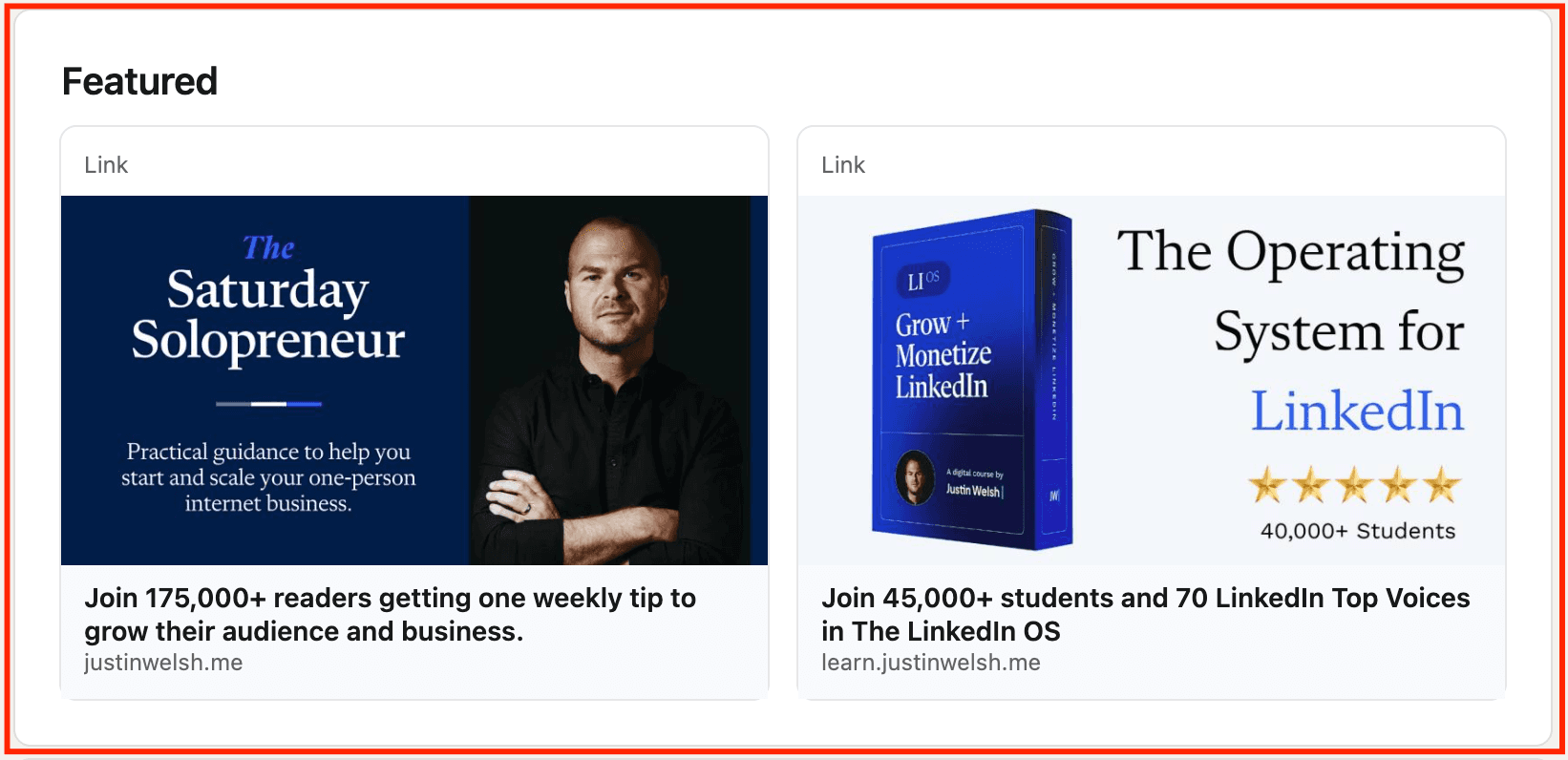 For inspiration, look at Justin Welsh’s profile. His featured section has his course links and practical templates to reinforce his authority while guiding visitors to take action.