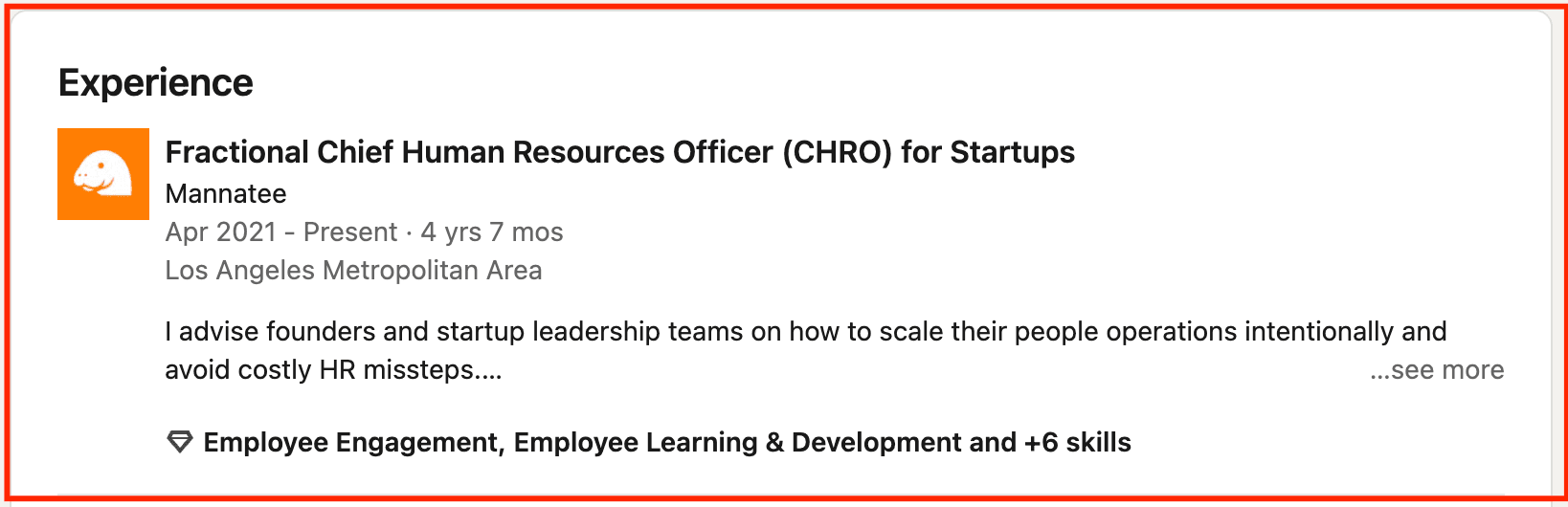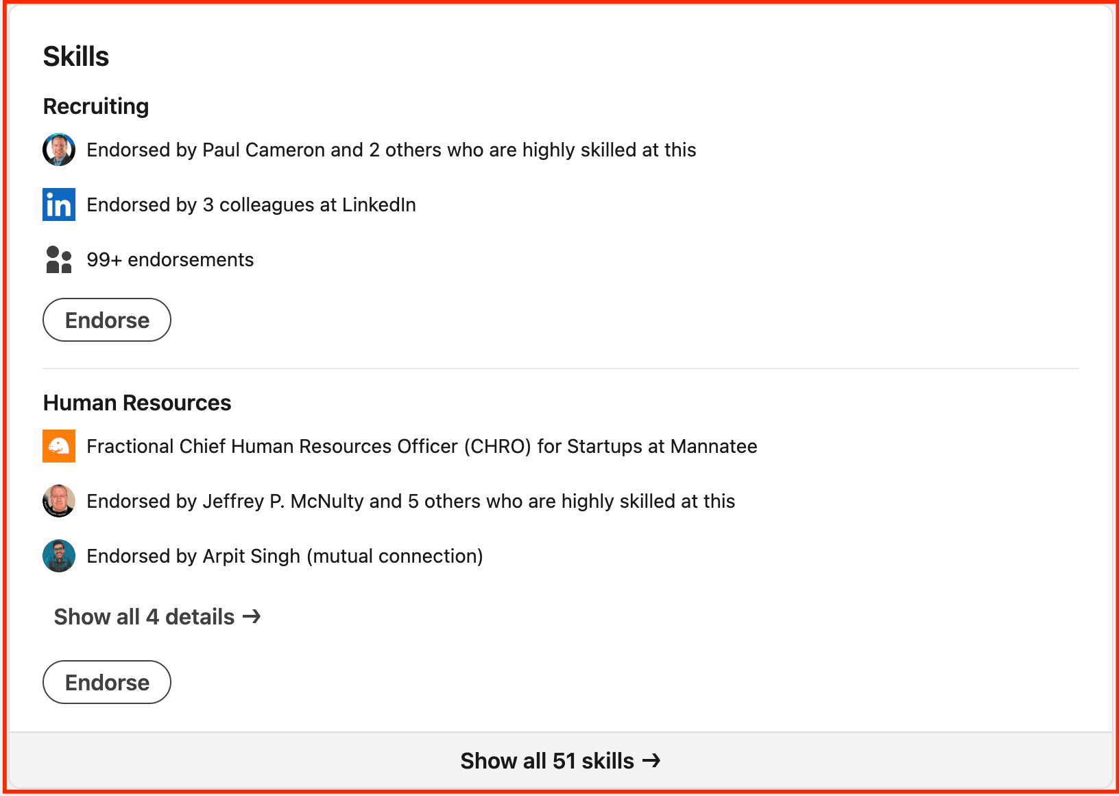 Take HR Leader Madeline Mann as an example. Her skill list is precise and aligned with her consulting niche, while her recommendations emphasize results and collaboration. Together, they make her profile both searchable and trustworthy.