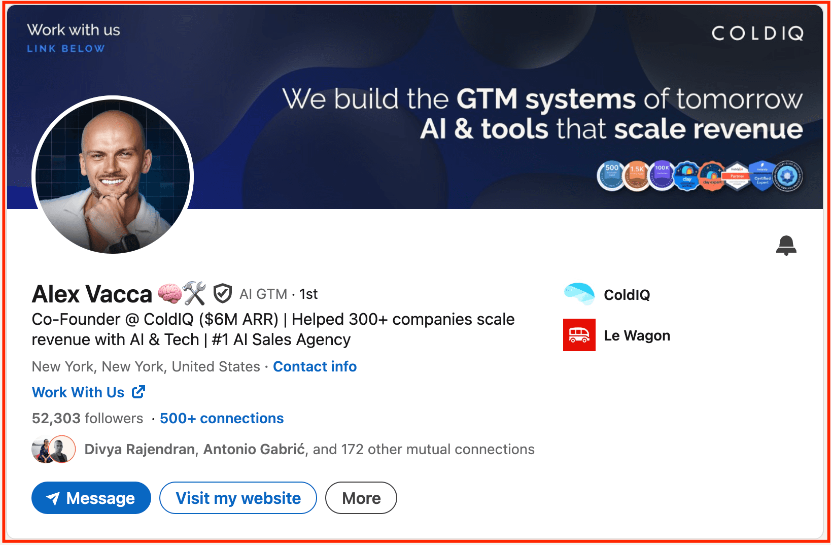 For example, Alex Vacca’s banner says, “We build the GTM systems of tomorrow.”