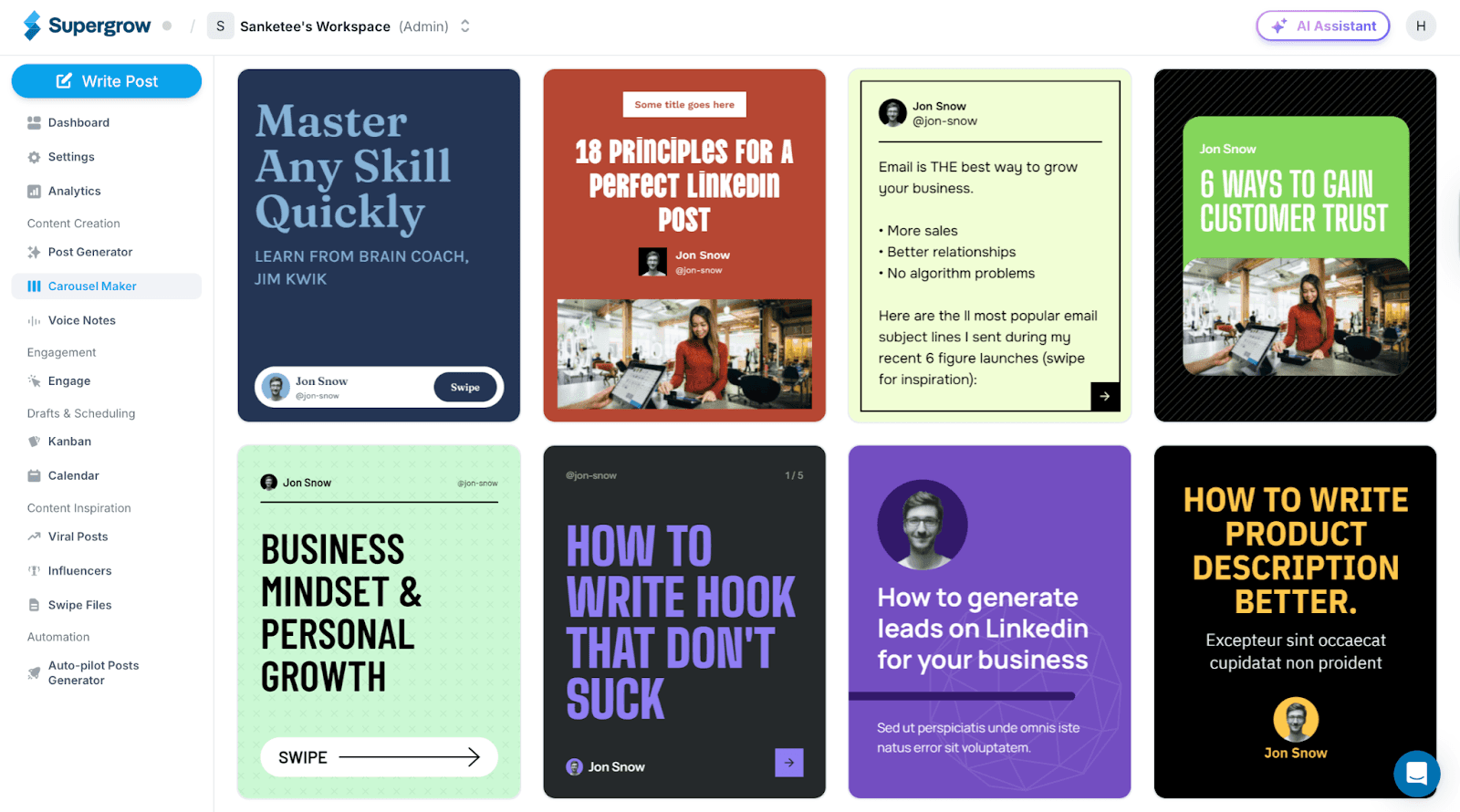 Supergrow helps you turn top-performing posts into branded carousels in minutes to keep your ideas visible long after they trend. It’s the simplest way to create evergreen assets that keep building authority.