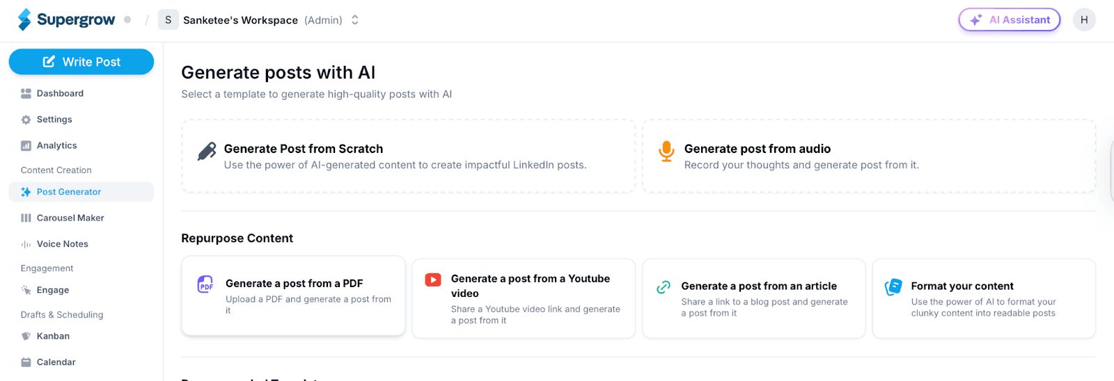 Supergrow’s post generator helps you create post ideas that match your tone, niche, and positioning. You can also repurpose long-form content like blogs, videos, or PDFs into engaging, LinkedIn-ready formats that keep your page buzzing.