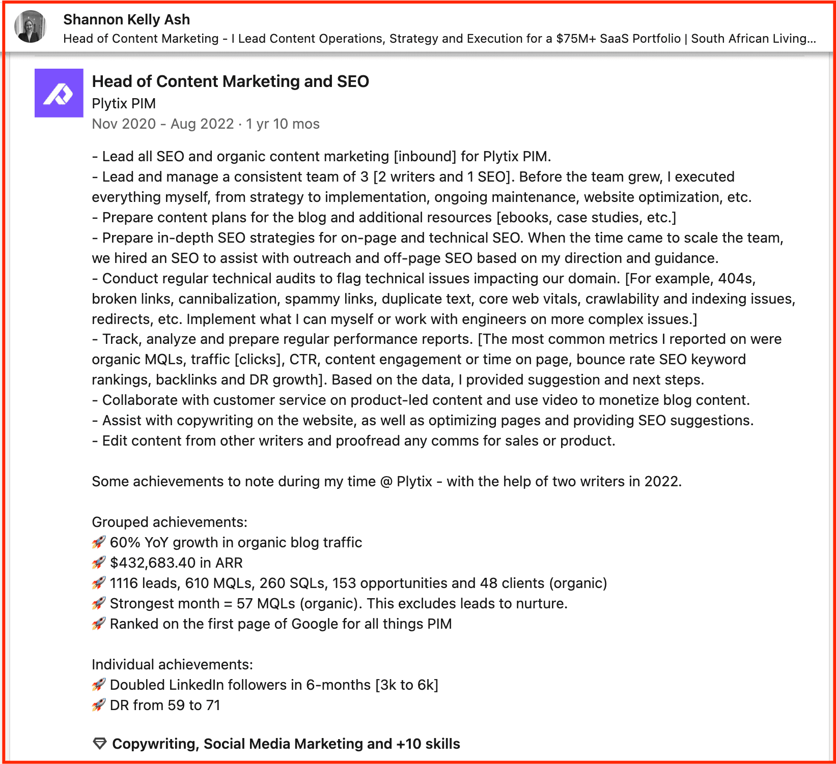 For instance, Shannon Kelly Ash’s experience section at Plytix is an excellent example of results-driven storytelling.