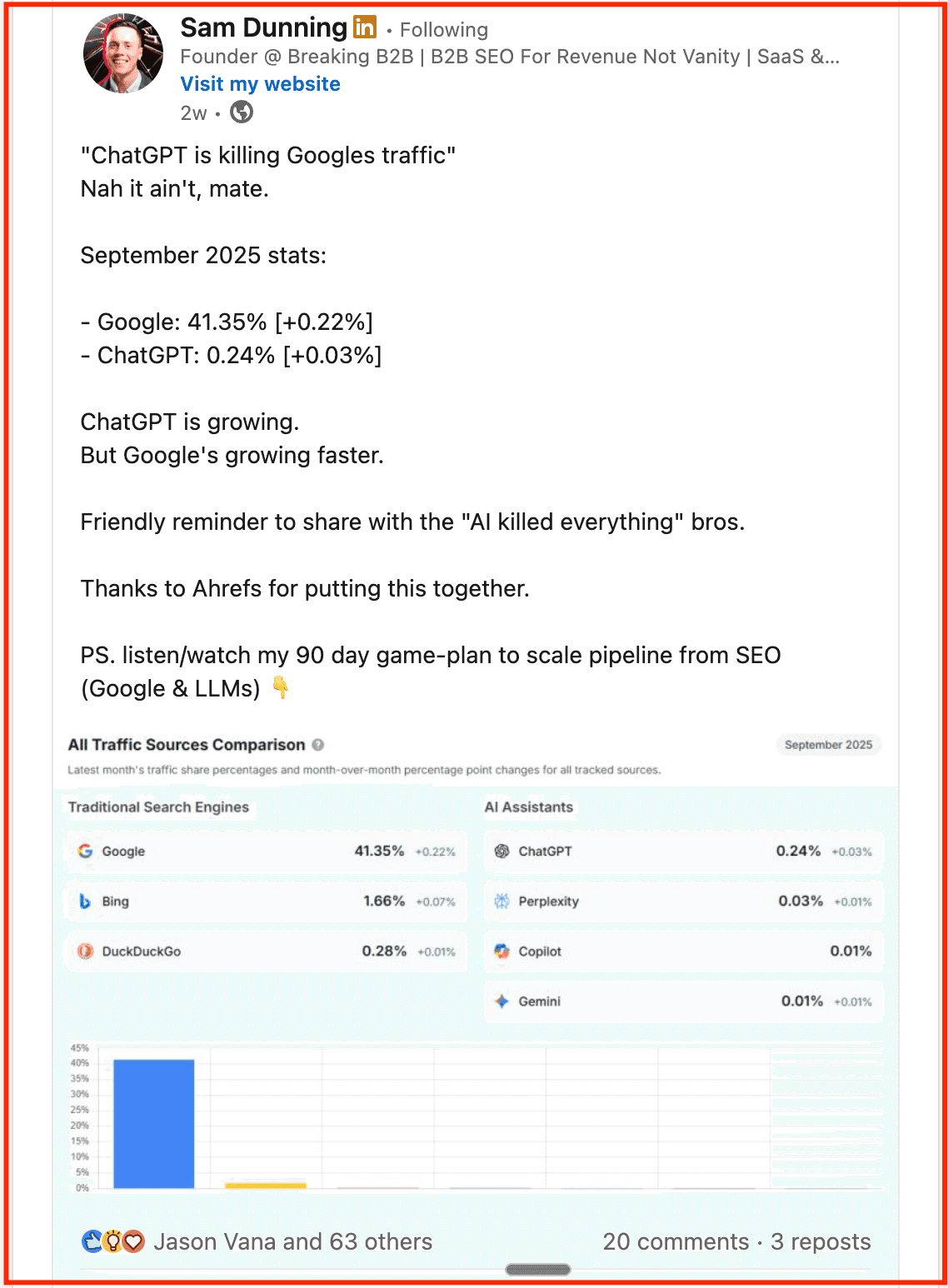 For instance, Sam Dunning breaks down SEO vs. AI traffic trends with a clear takeaway for marketers, exactly the kind of analysis his ICP (B2B founders and marketing leaders) values. By consistently sharing content that reflects his expertise and the target audience’s interests, he strengthens his authority and credibility within the SaaS SEO niche.