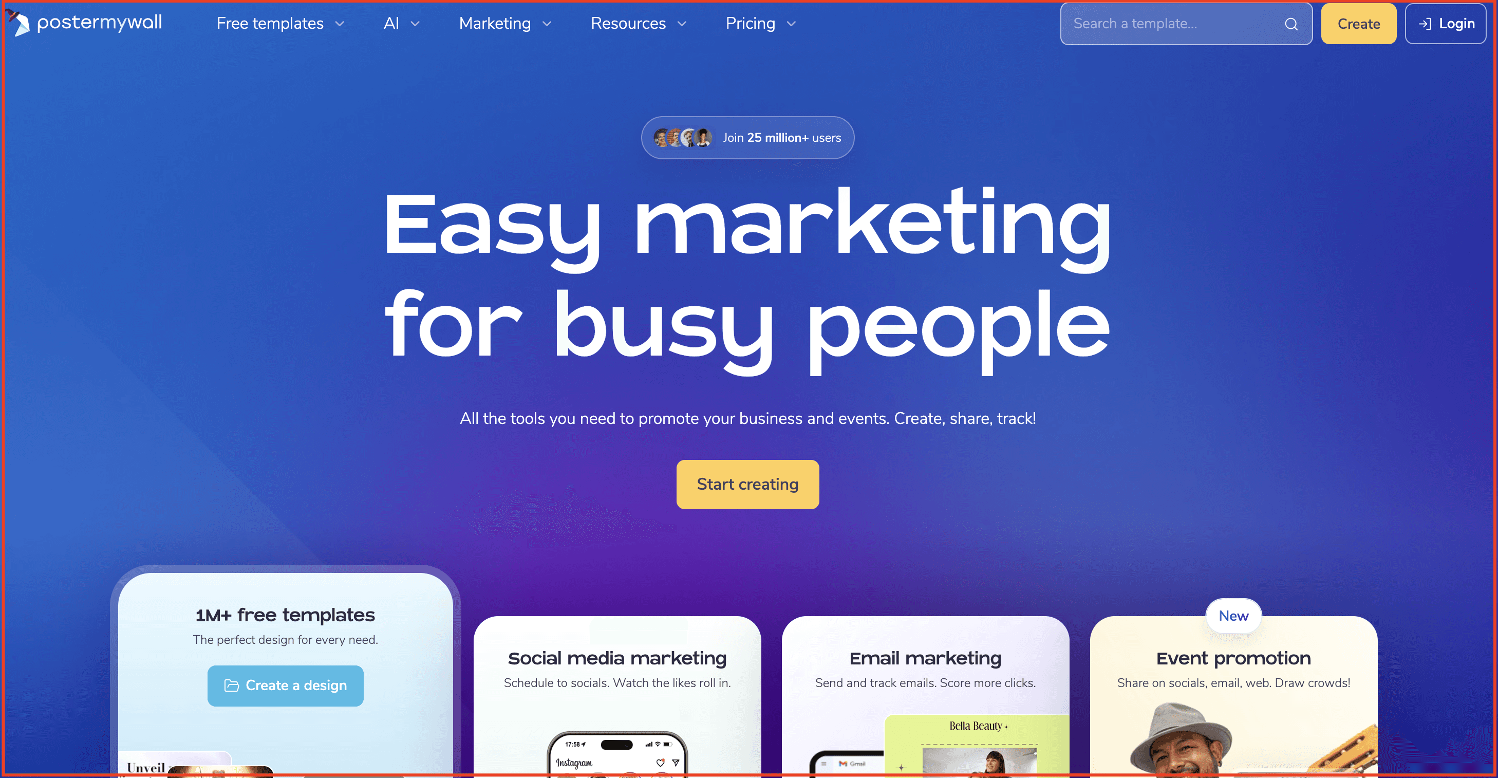 PosterMyWall is a powerful, beginner-friendly design and marketing tool used by small businesses, content creators, and marketers around the world. It’s an all-in-one online platform that not only helps you design professional graphics but also lets you publish, promote, and resize content.