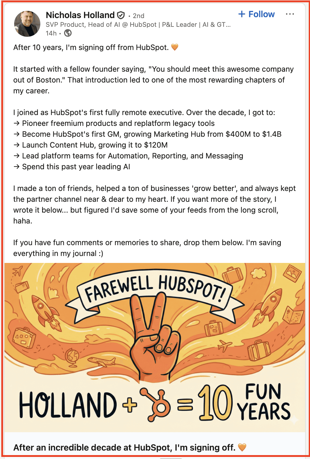 This is an excellent example of Nicholas Holland's farewell post. After an incredible decade at HubSpot, I'm signing off. 🧡