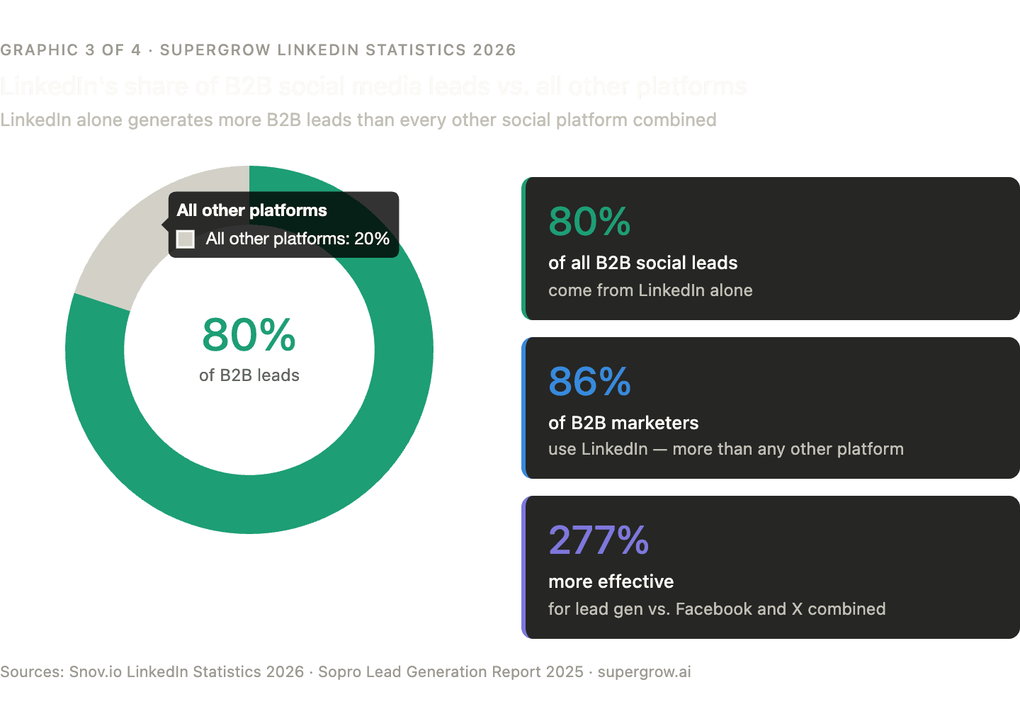 LinkedIn generates 277% more leads per impression than Facebook and X combined for B2B campaigns. 89% of B2B marketers use LinkedIn specifically for lead generation, and the platform accounts for 80% of all social media B2B leads — leaving the combined output of every other major platform at just 20%. (Sopro)