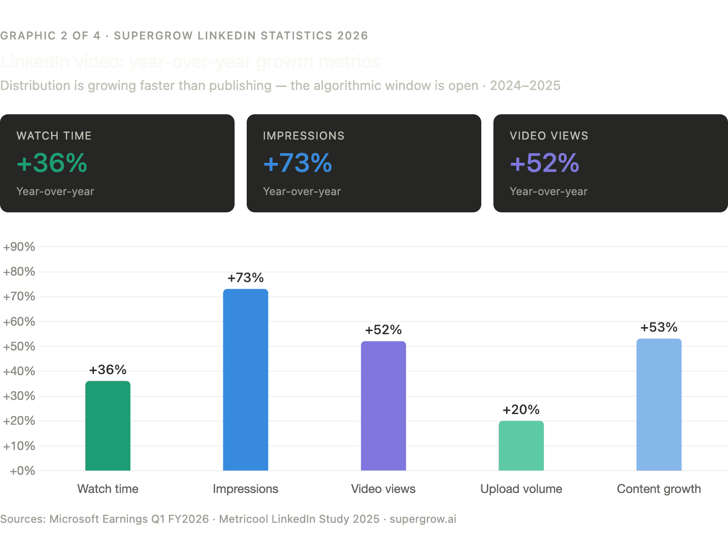 Video is the defining format shift on LinkedIn in 2025 and 2026. Watch time, upload volume, and impression growth are all accelerating simultaneously — a combination that signals a platform-level algorithmic shift, not just a user trend.