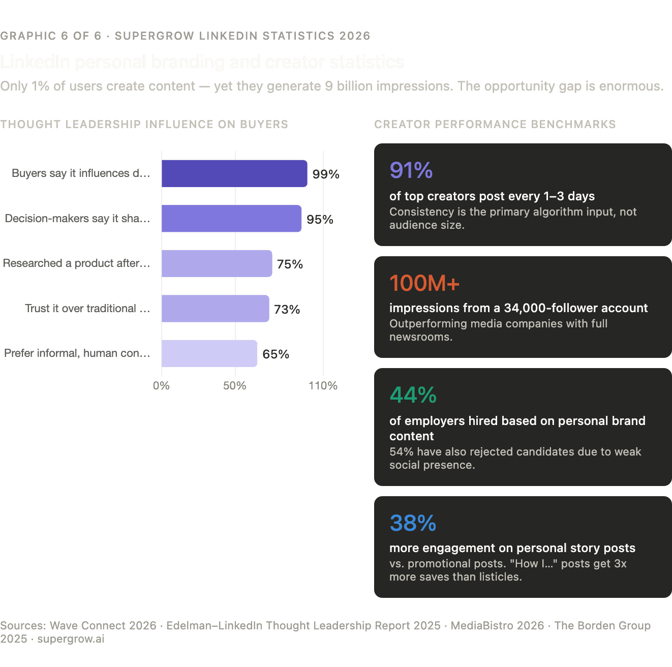 99% of buyers say thought leadership is a factor in their decision-making process, and 73% say they trust it more than traditional marketing. For professionals building a LinkedIn presence, this statistic reframes what it means to post: every piece of expert content is part of the commercial infrastructure that either builds or erodes trust with a potential buyer. (Wave Connect)