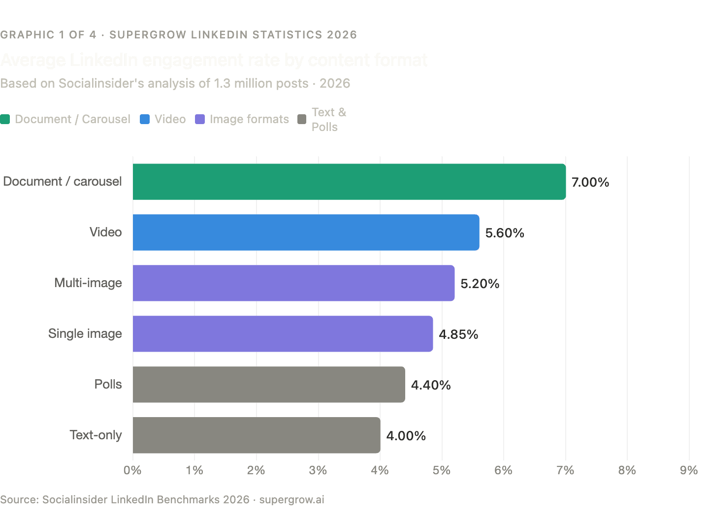 Socialinsider's 2026 benchmark analysis of 1.3 million posts confirmed that native document posts — PDFs uploaded directly to LinkedIn — achieve the highest average engagement rate of any format at 7.00%, with a 14% year-over-year increase. Carousel posts drive 3x more reach than standard posts and generate significantly more saves and shares than any text-only equivalent. (Socialinsider)