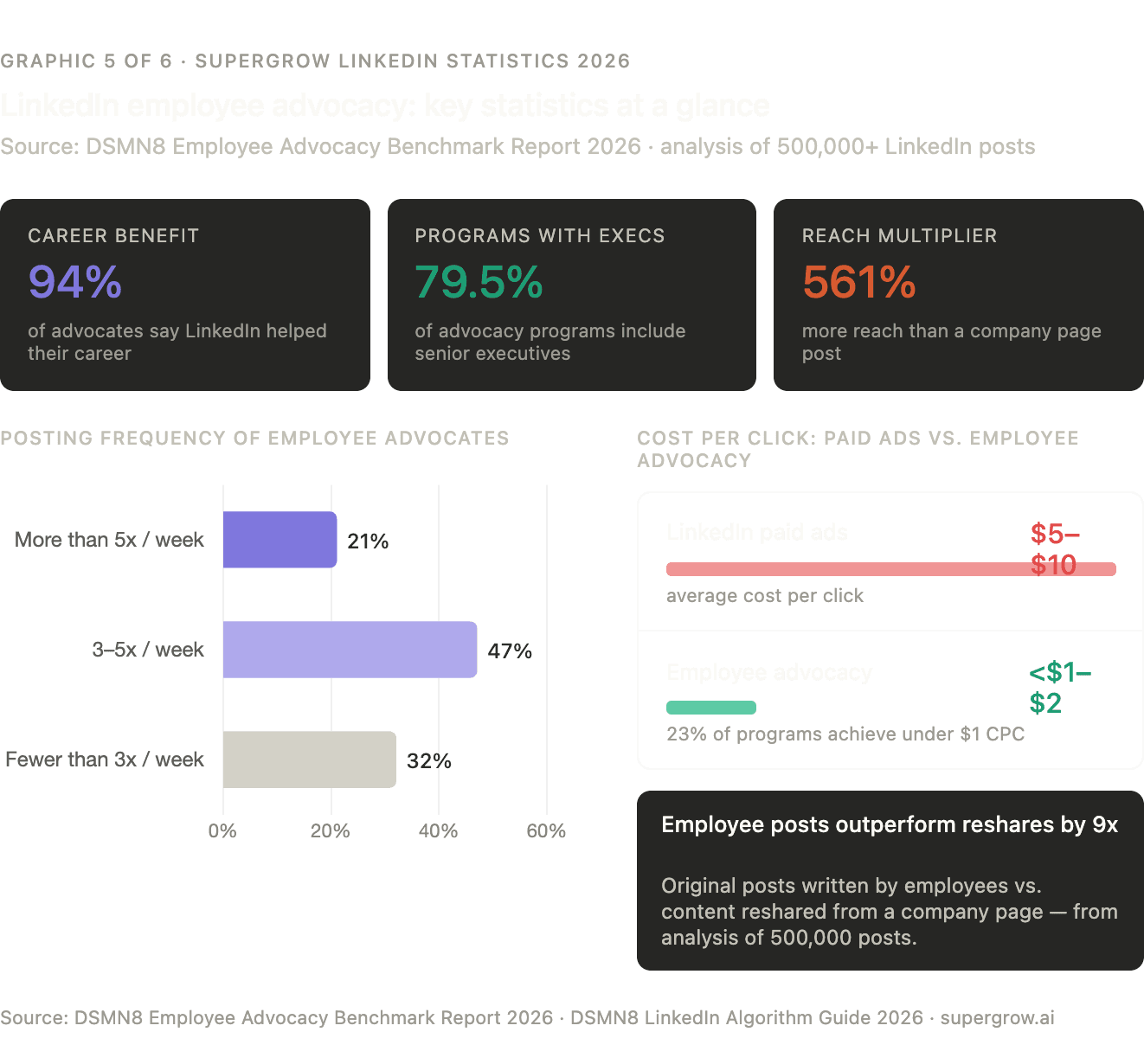 DSMN8's 2026 Employee Advocacy Benchmark Report — surveying over 200 programs, including data from Cisco, Capgemini, Nissan, and Toyota — found that 94% of employee advocates say posting on LinkedIn has directly benefited their careers. This bilateral value is what sustains advocacy programs over time: employees are not sharing for the company's benefit; they are sharing for their own, which makes the content more authentic and the outcomes more durable. (DSMN8)