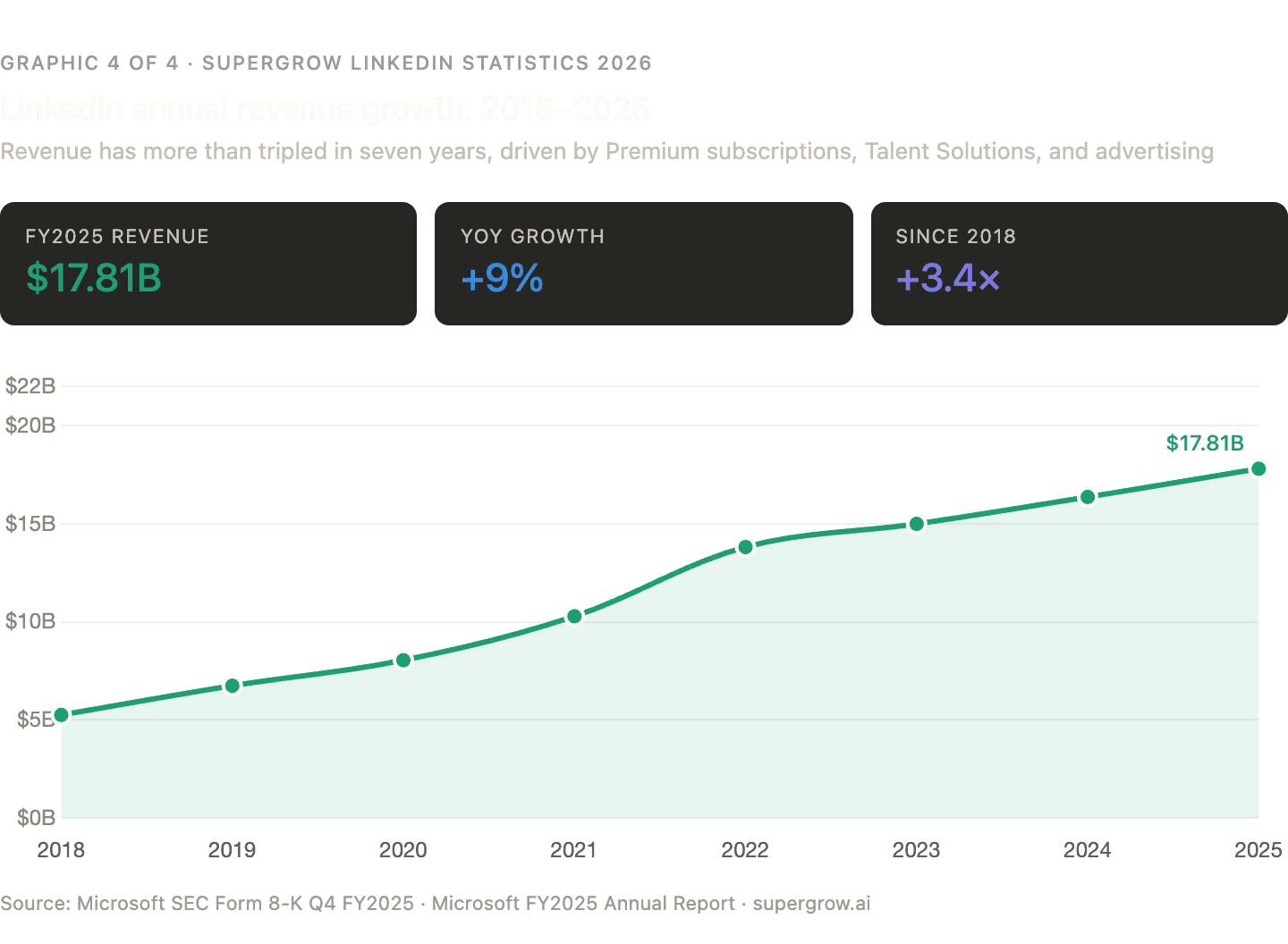 LinkedIn's revenue has more than tripled since 2018, when it sat at $5.26 billion. By fiscal year 2025, it reached $17.81 billion — a 9% year-over-year increase — driven by Premium subscriptions, advertising, and talent solutions. The platform crossed the $5 billion quarterly revenue milestone for the first time in Q4 2025. (Microsoft SEC Form 8-K, Q4 FY2025)
