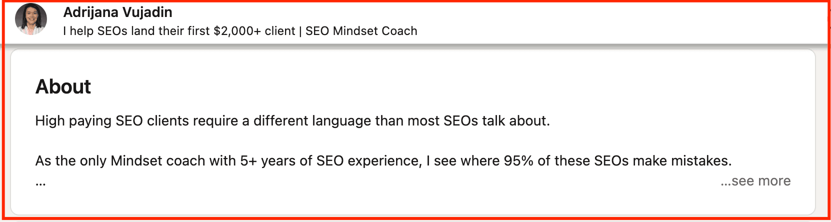 LinkedIn shows only 2-3 lines of your summary (300 characters) before readers must click “see more” if they want to keep reading. And this is where many people fail with their summaries.