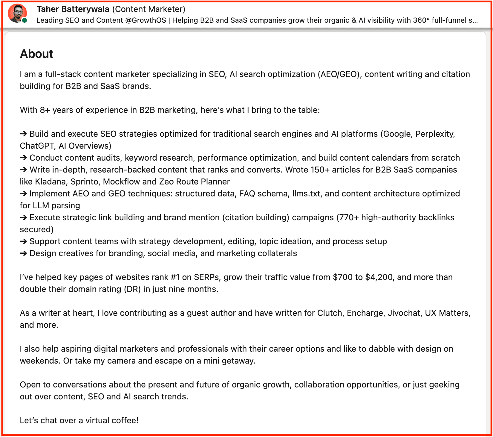 This framework works best for freelancers, agencies, and B2B service providers who want their summary to function more like a conversion-focused landing page than a bio.
