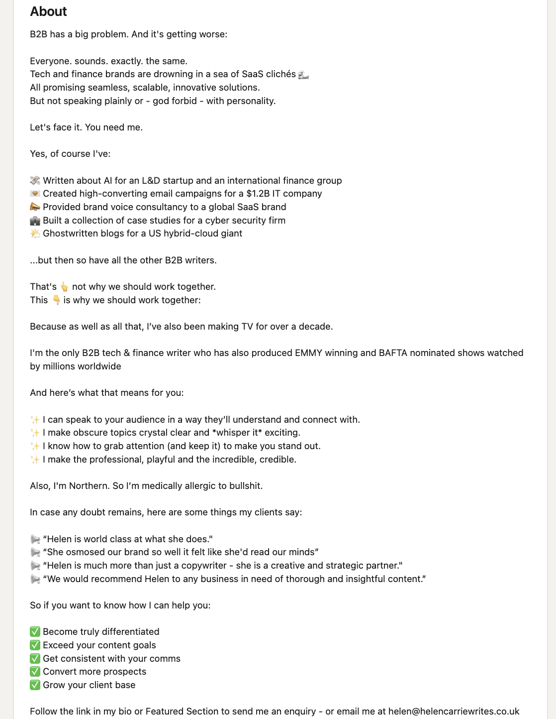 Helen Carrie speaks virtually to every aspect of this framework. She addresses a striking POV, “B2B has a big problem. And it's getting worse”, that makes people click on the “See more” button.