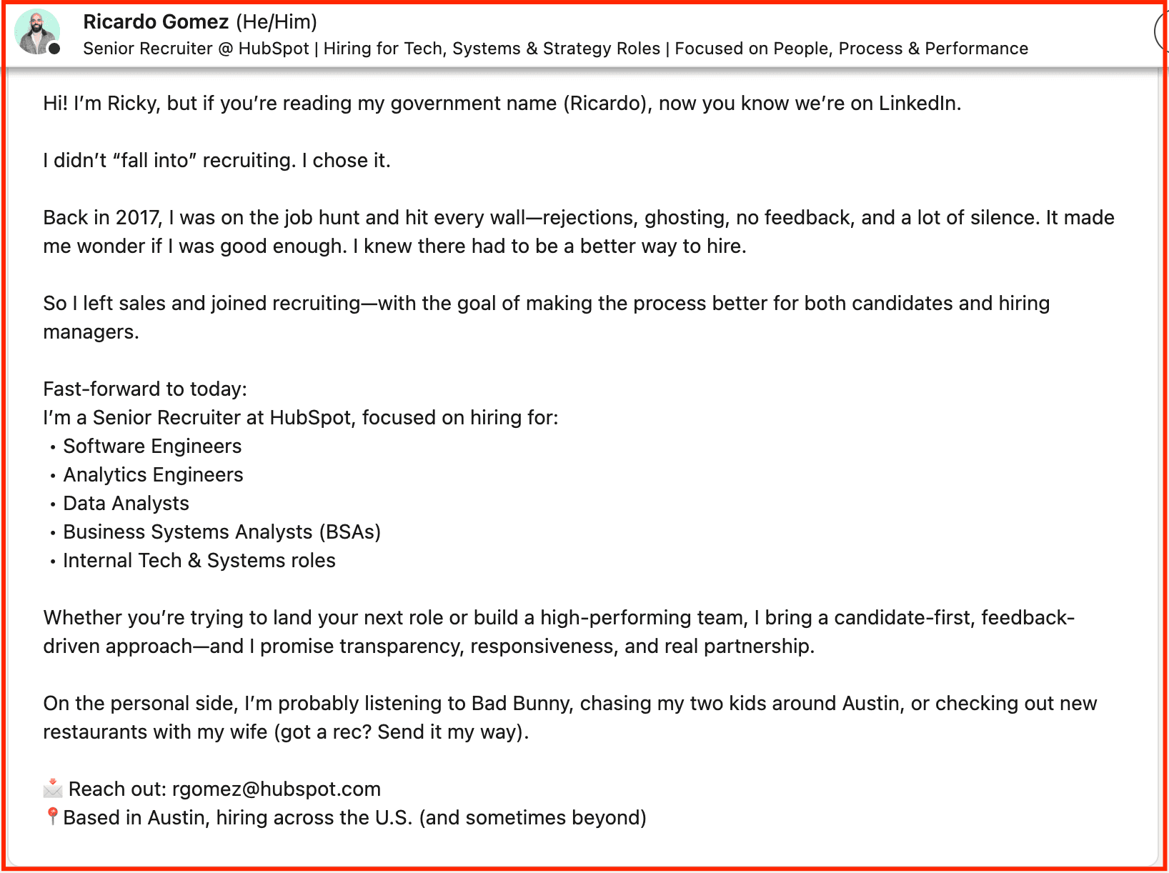 Ricardo Gomez keeps it real with a LinkedIn summary on how he attracts and retains top talent for his clients. Right from the start, we see her personal mission presented succinctly and effectively.