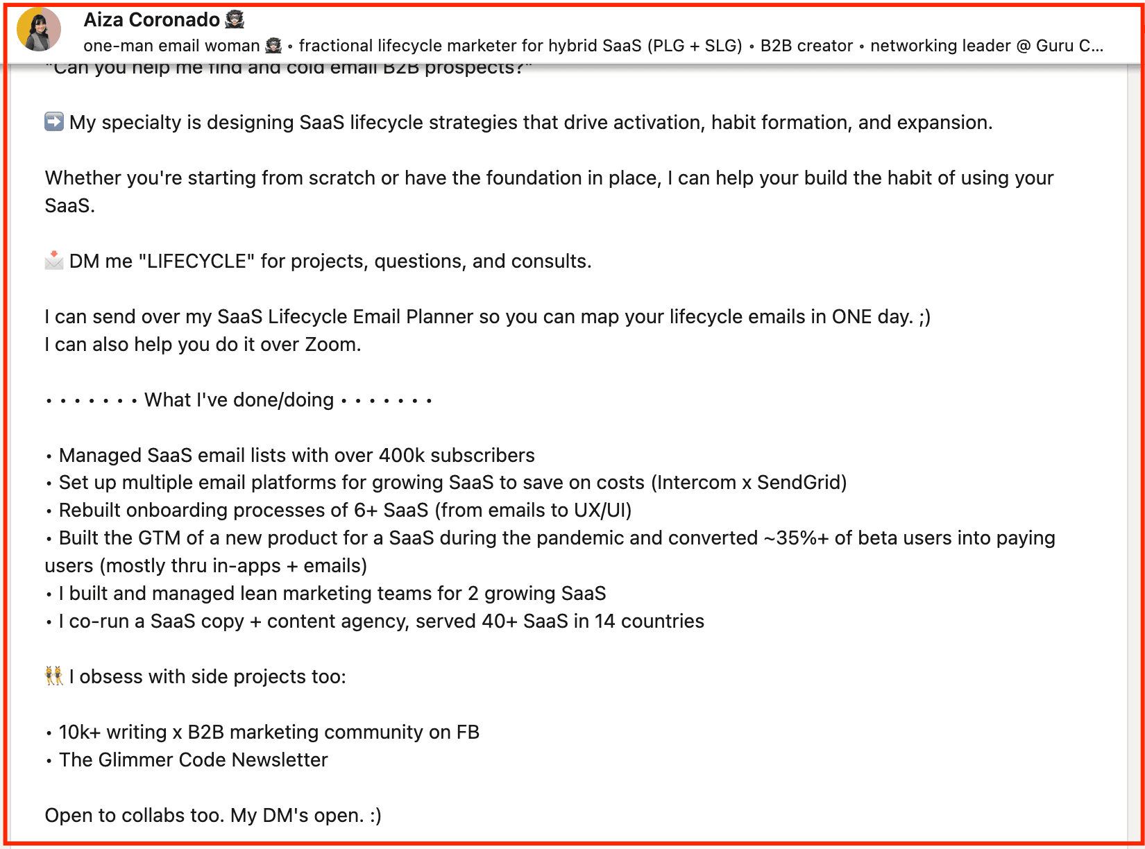 You lack a single outcome–the reader doesn’t know whether to follow, message, or hire.