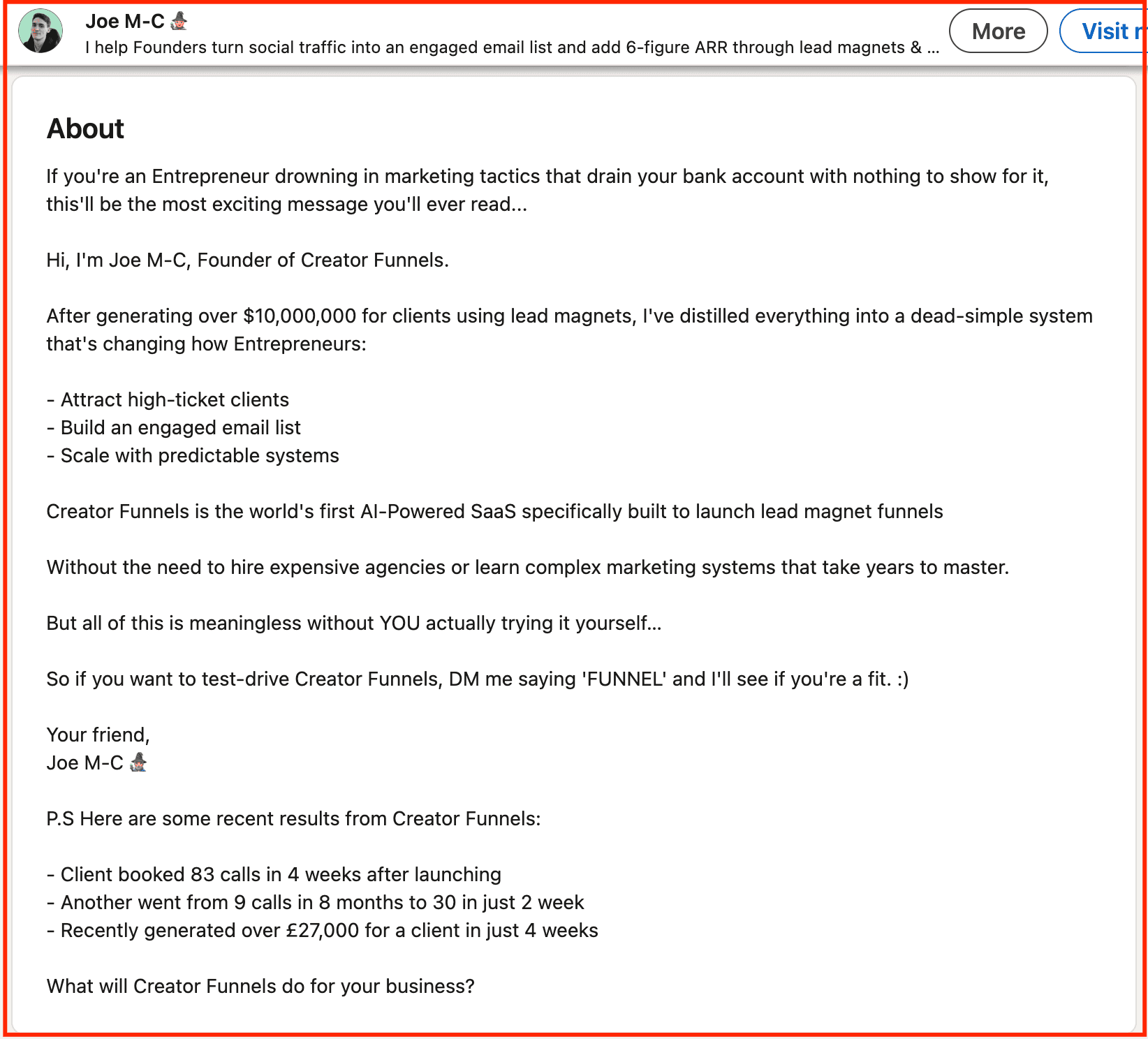 Joe M's strong opening not only captures attention but also defines the clients he’s targeting in this LinkedIn summary. With the first two sentences, Joe puts himself in the shoes of his prospects and then follows it with the outcome the reader would want.
