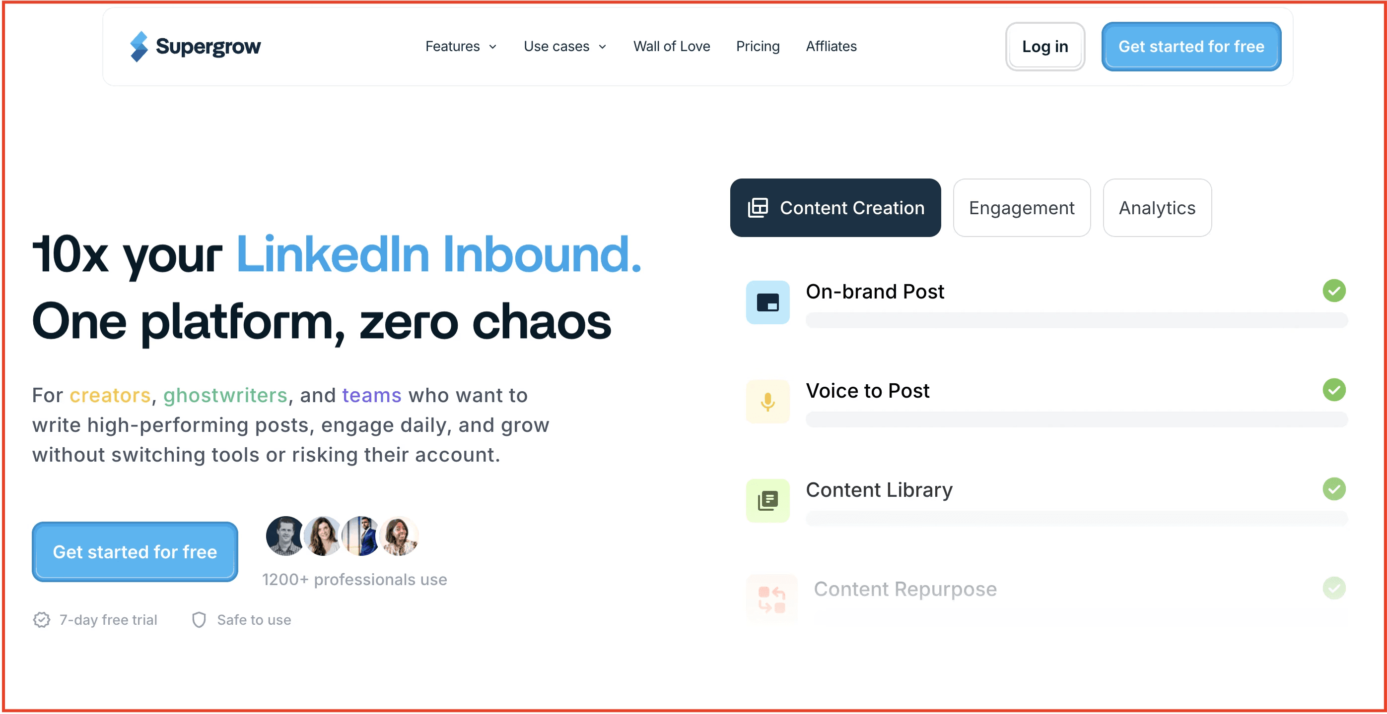 Supergrow is the top LinkedIn-first personal branding platform for creators, founders, marketers, and agencies who want a safe, authentic, and consistent way to grow on LinkedIn—without relying on risky automations or generic AI content.
